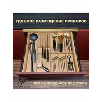 Лоток предназначен для хранения столовых приборов и кухонной утвари в выдвижном ящике.