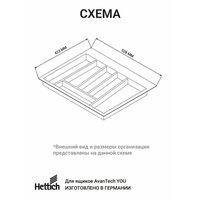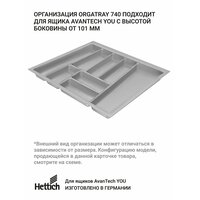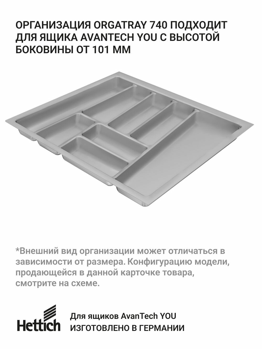 Hettich OrgaTray 740 подходит для ящика AvanTech YOU с высотой боковины от 101 мм. Для стандартной ширины корпуса, для толщины боковины 16 мм.