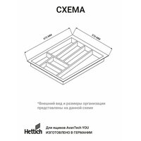 Hettich OrgaTray 740 подходит для ящика AvanTech YOU с высотой боковины от 101 мм. Для стандартной ширины корпуса, для толщины боковины 16 мм.