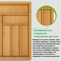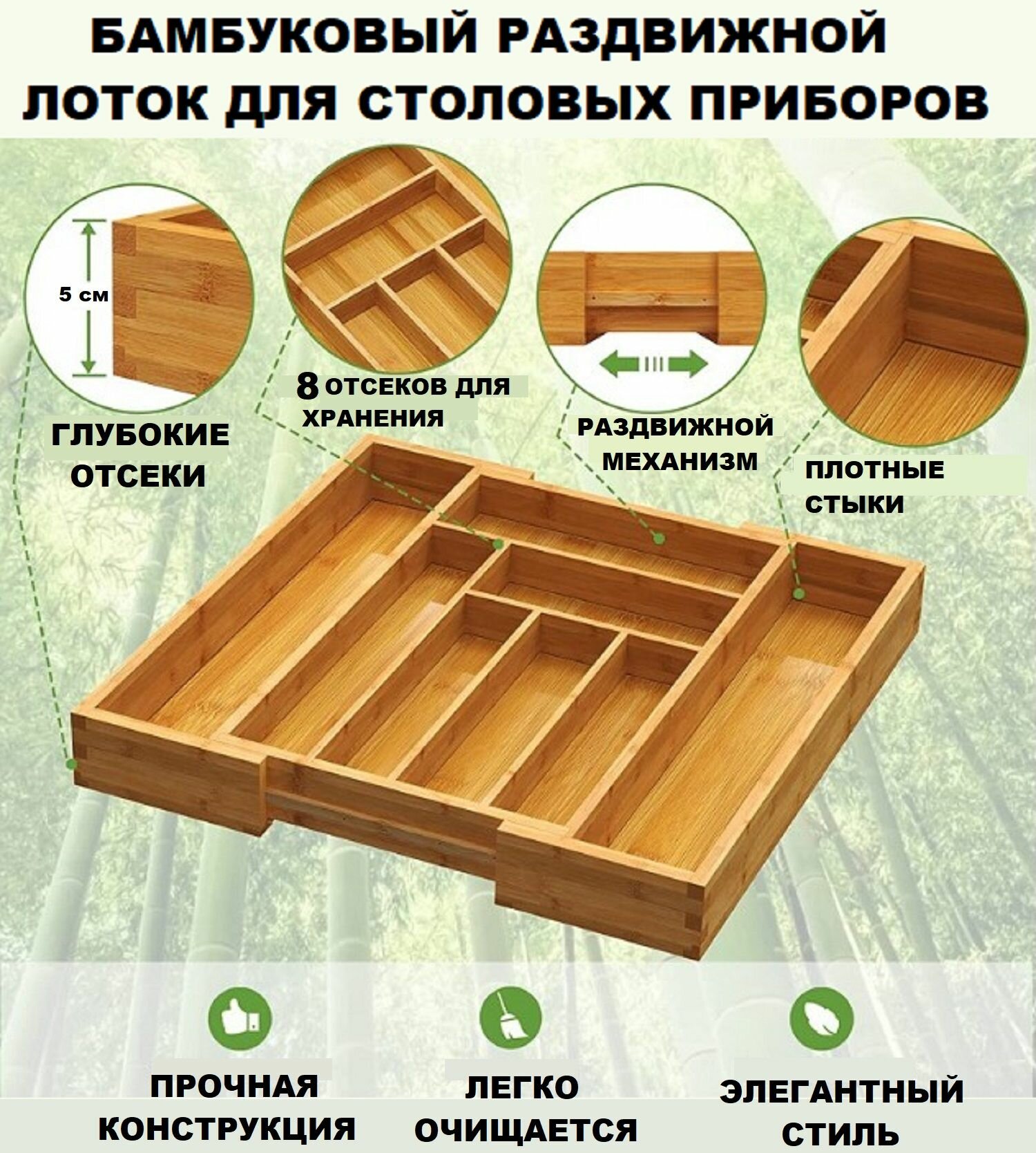 Благодаря использованию древесины бамбука лоток для столовых приборов в ящик обладает быстросохнущими свойствами. Поглощает меньше бактерий. Бамбуковое дерево придает ему элегантный вид.