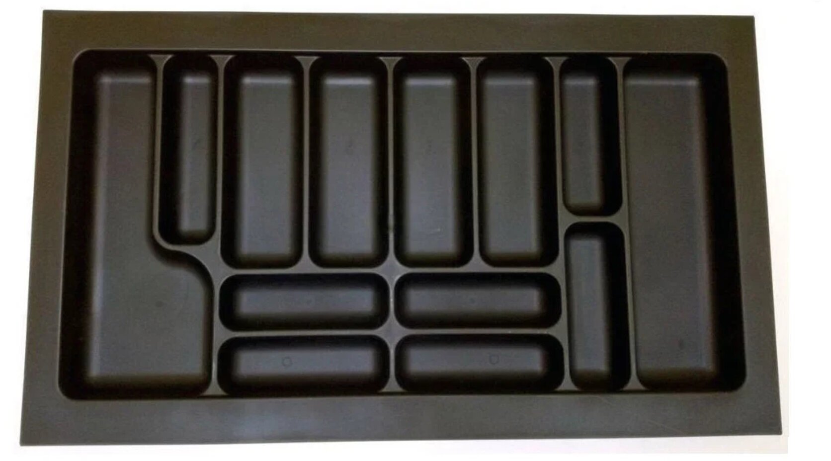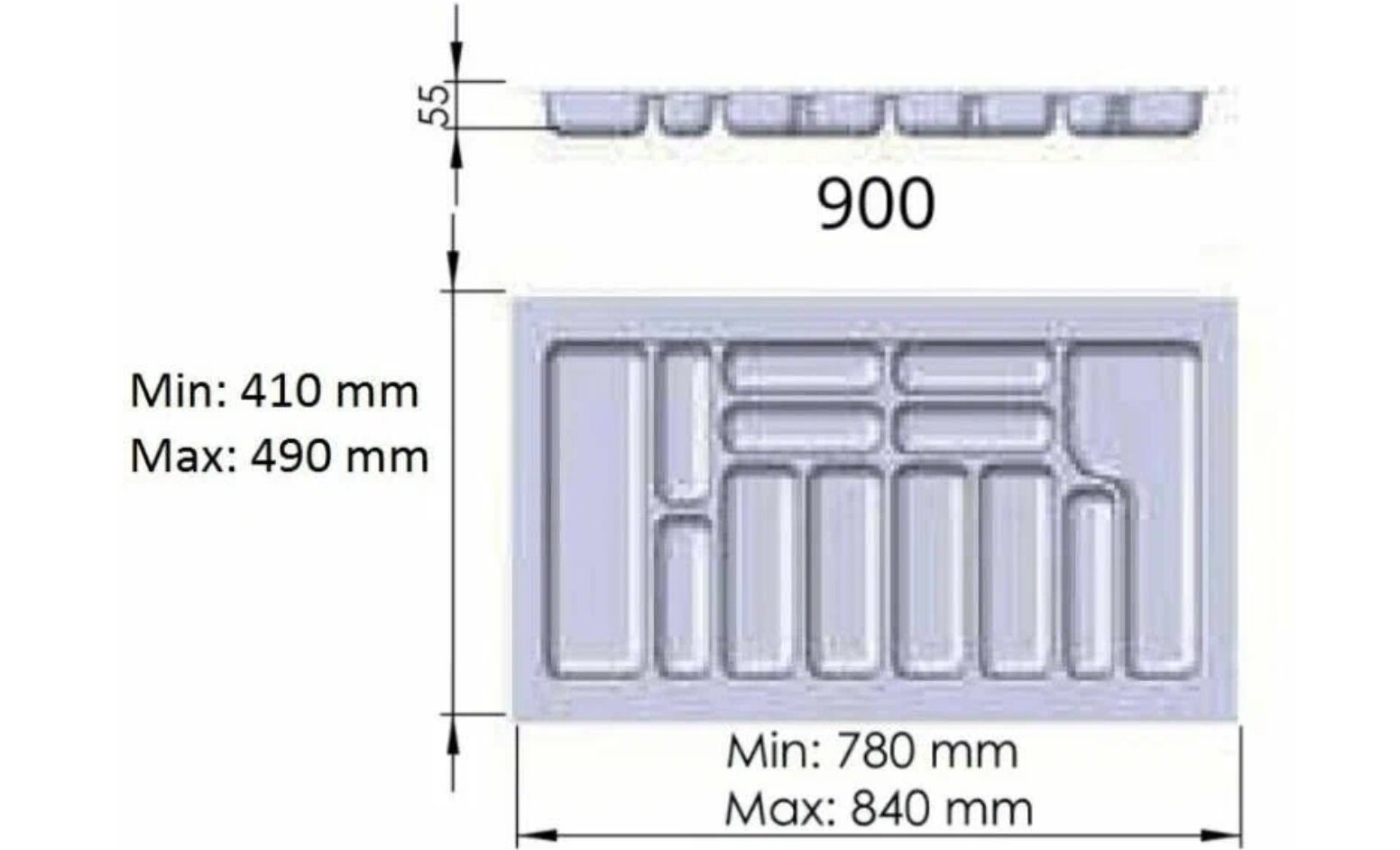 Лоток для столовых приборов Starax, в модуль 900, чёрный - кухонный аксессуар, необходимый практически в любом доме. Лоток позволяет удобно рассортировать внутри кухонного ящика ложки, вилки, ножи и другие постоянно используемые столовые приборы. Лоток специально подбирается под размеры конкретного ящика стола или кухонного гарнитура. При необходимости можно самостоятельно уменьшить размеры лотка, подрезав его по месту, но в пределах, установленных производителем. У данной модели: - длина (глубина лотка при установке) может быть уменьшена с 490 мм до 410 мм. - ширина 840 мм может быть уменьшена до 780 мм.
