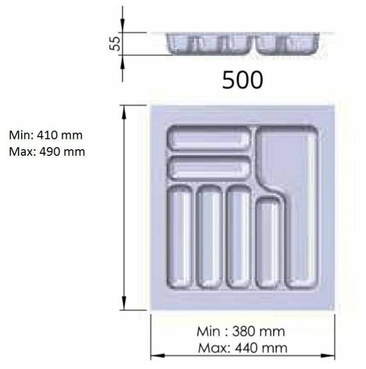Лоток для столовых приборов Starax, в модуль 500, белый - кухонный аксессуар, необходимый практически в любом доме. Лоток позволяет удобно рассортировать внутри кухонного ящика ложки, вилки, ножи и другие постоянно используемые столовые приборы. Лоток специально подбирается под размеры конкретного ящика стола или кухонного гарнитура. При необходимости можно самостоятельно уменьшить размеры лотка, подрезав его по месту, но в пределах, установленных производителем. У данной модели: - длина (глубина лотка при установке) может быть уменьшена с 490 мм до 410 мм. - ширина 440 мм может быть уменьшена до 380 мм.