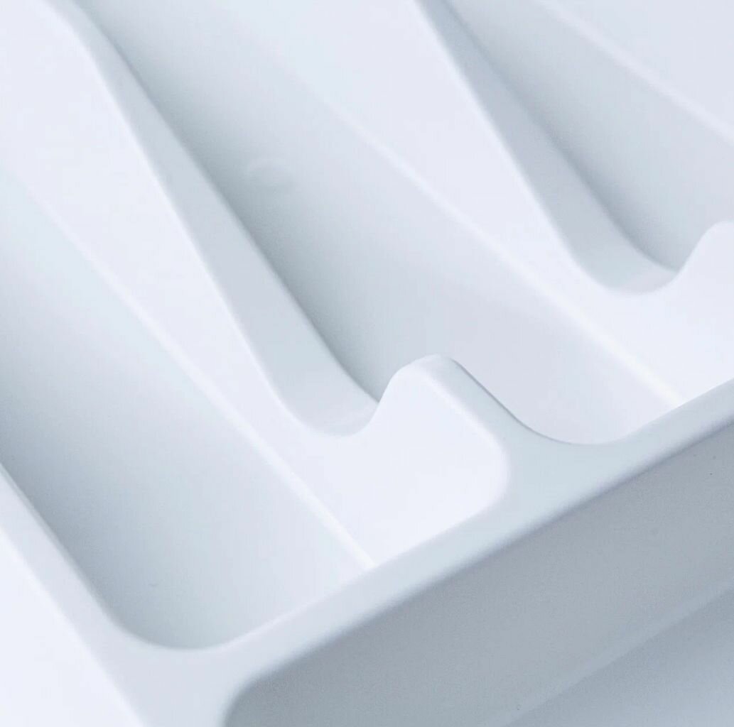 Лоток позволяет удобно рассортировать внутри кухонного ящика ложки, вилки, ножи и другие постоянно используемые столовые приборы. Лоток специально подбирается под размеры конкретного ящика стола или кухонного гарнитура. При необходимости можно самостоятельно уменьшить размеры лотка, подрезав его по месту.