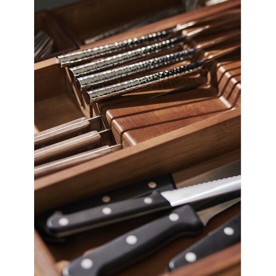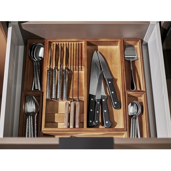 - Изготовлен из бамбука – экологичного материала, который гарантирует долговечность и безопасность использования. - Имеет несколько отделений и специальный держатель для ножей, что позволяет раздельно хранить все виды столовых приборов. - За счет лаконичного дизайна и естественной цветовой гаммы вписывается в различные интерьерные решения.