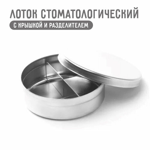 Лоток стоматологический (Чашка Петри) с крышкой и разделителем ¼ предназначен для проведения различных медицинских манипуляций в условиях стоматологических клиник. Область применения: размещение и хранение различного колющего, режущего стерильного инструмента; стерилизация медицинского инструмента и расходных материалов. Лоток медицинский стоматологический изготовлен из полированной нержавеющей аустенитной стали AISI 304 (12Х18Н9). Высокая коррозионная устойчивость достигнута благодаря большому содержанию хрома в сплаве металла. Из-за низкого содержания углеродистой стали металл не магнитится. Лоток устойчив к циклу санобработки, состоящему из дезинфекции, предстерилизационной очистки и стерилизации в соответствии с режимами МУ-287-113 для изделий из нержавеющих сталей. Специально разработанная форма штампа при изготовлении лотков придаёт изделию жёсткость, что исключает изменение геометрии при использовании, а также обеспечивает качественную очистку и обработку дезинфицирующими препаратами. Острые кромки лотка скруглены и защищают руки медицинского работника от повреждений. Крышка свободно надевается и плотно прилегает к верхнему краю лотка, что обеспечивает защиту медицинского инструмента от попадания грязи и пыли, а также исключает возможность испарения дезинфицирующих средств. Специальный съёмный разделитель позволяет сгруппировать мелкий инструмент.