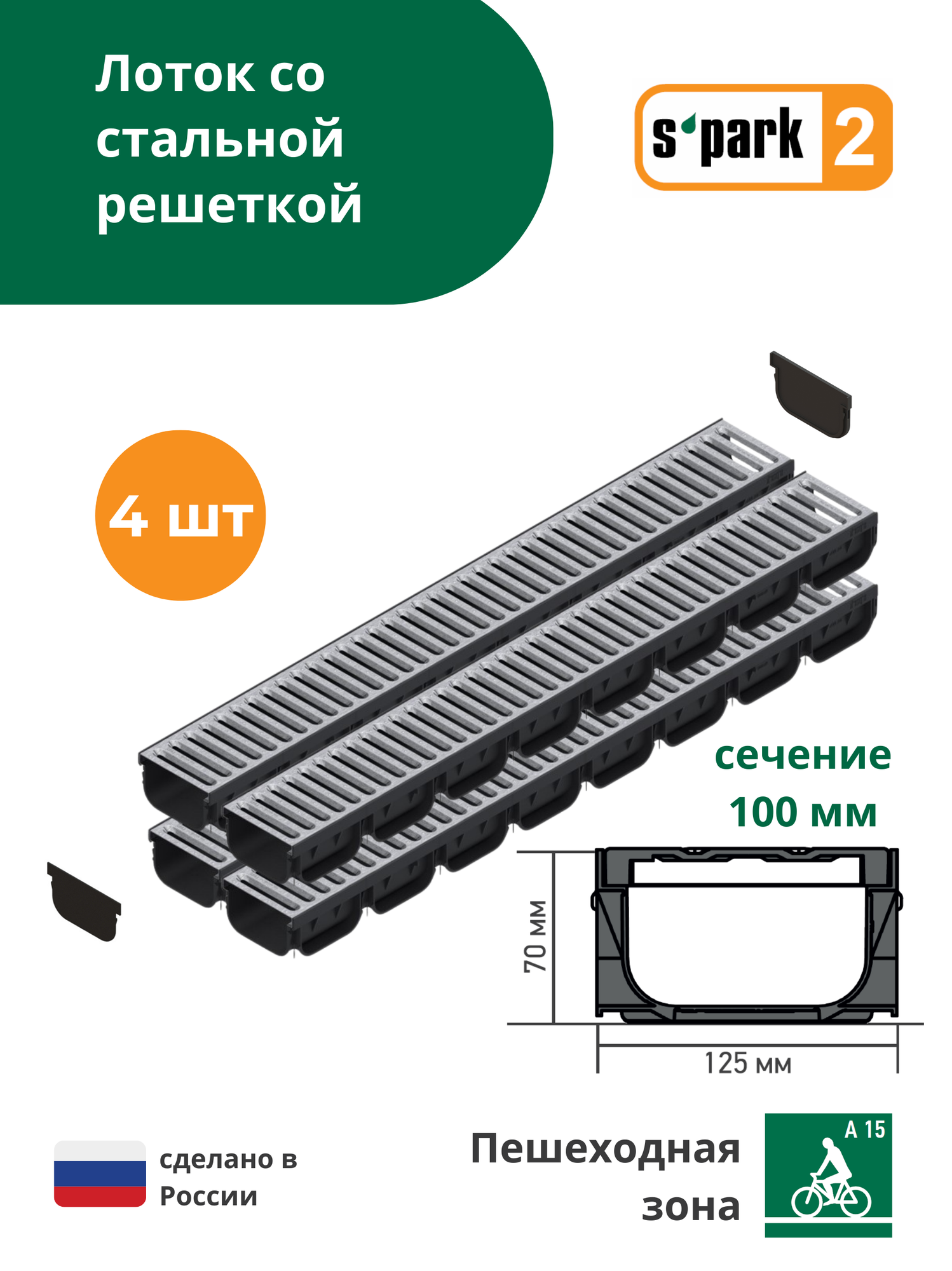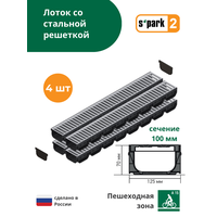 Лоток пластиковый водоотводной Стандартпарк S'park 2 со стальной оцинкованной решеткой DN100 имеет класс нагрузки А15. Применяется для отведения дождевой и талой воды с тротуаров, дорожек, фундамента на частном участке, где исключительно пешеходная нагрузка. Решетки крепятся на лоток при помощи защелок без дополнительных крепежей. Комплект включает в себя: 4 лотка пластиковых со стальной оцинкованной решеткой, 2 пластиковые заглушки. Ширина, мм: 125 Высота, мм: 70 Длина, мм: 1000 Класcы нагрузки: A15 Гидравлическое сечение: DN100 Водоотводный лоток оборудован ребрами жесткости опорными лапами, замками для соединения лотков в линию. Монтаж лотков рекомендуется начинать от точки сброса – места, где осуществляется подключение лотков к канализации. Начало и конец линии так же можно определить по направлению стрелки, расположенной на дне лотка. Сброс воды из линии лотков может быть организован 2 способами: вертикально в канализационную трубу или через дождесборник (Код товара: 202503964) или пескоуловитель (Код товара: 206441988). В первом случае начало и конец линии лотков необходимо закрывать заглушками. Заглушка пластиковая универсальная, в начале линии она монтируется на защелки до щелчка, в конце линии заглушка переворачивается и также монтируется на защелки до щелчка. При монтаже заглушек рекомендуется использовать герметик для предотвращения разлива дождевой воды. Герметик наносится по периметру стыка лотка с заглушкой. При монтаже линии лоток опускается сверху вниз в выступающую часть замка другого лотка до щелчка. Замок состоит из подвижных защелок, которые фиксируют лотки от всплывания относительно друг друга и расползания в длину и позиционных штырей, предотвращающих смещение лотков в стороны относительно друг друга. В конструкции лотка имеются боковые отводы, предназначенные для Т-образного соединения аналогичного лотка под углом 90 градусов. В лотке основной линии, к которому производится подключение прорезается боковой отвод. В паз на подключаемом лотке наносится герметик, а затем, подключаемый лоток стыкуется с лотком основной линии. Для организации вертикального отвода воды из лотка применяется специальный патрубок (Код товара: 202513644). Он позволяет отвести воду канализационными трубами 110 мм. Патрубок может быть смонтирован на любой из отводов на лотке, предварительно в отводе прорезается отверстие. Патрубок на лоток и труба на патрубок монтируются внатяг по сечению. В случае сброса дождевых стоков через дождесборник, лоток серии S'park 2 подключается при помощи переходника (Код товара: 202513913). Сначала переходник монтируется на лоток Spark 2, а затем подключается к дождесборнику через боковые отводы (ДС), которые расположены с четырех сторон. Предварительно необходимый шаблон прорезается. Стыки обязательно герметизируется. В начале линии необходимо установить заглушку смонтировав ее в паз, предварительно отломав ушки. В данном случае необходима только одна заглушка на начало линии. В случае сброса дождевых стоков через пескоуловитель, лотки серии S'park 2 подключаются к нему напрямую. Для подключения лотка S'park 2 ничего дополнительно прорезать не надо. Далее лоток опускается сверху вниз до срабатывания защелок. Стыки обязательно герметизируется. Лотки к пескоуловителю могут быть подключены с двух сторон, в следствии чего образуетс
