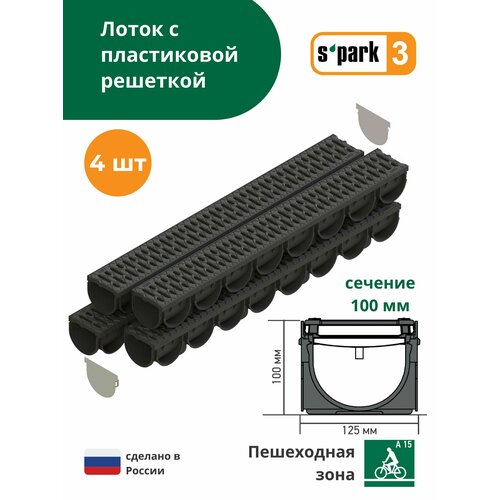 Лоток водоотводной пластиковый S’park 3 (1000х125х100, сечение 100) — 4 шт с пластиковой решеткой (кл. А15) Standartpark (Стандартпарк): сравнение цен, характеристики, фото, актуальное наличие и цены.