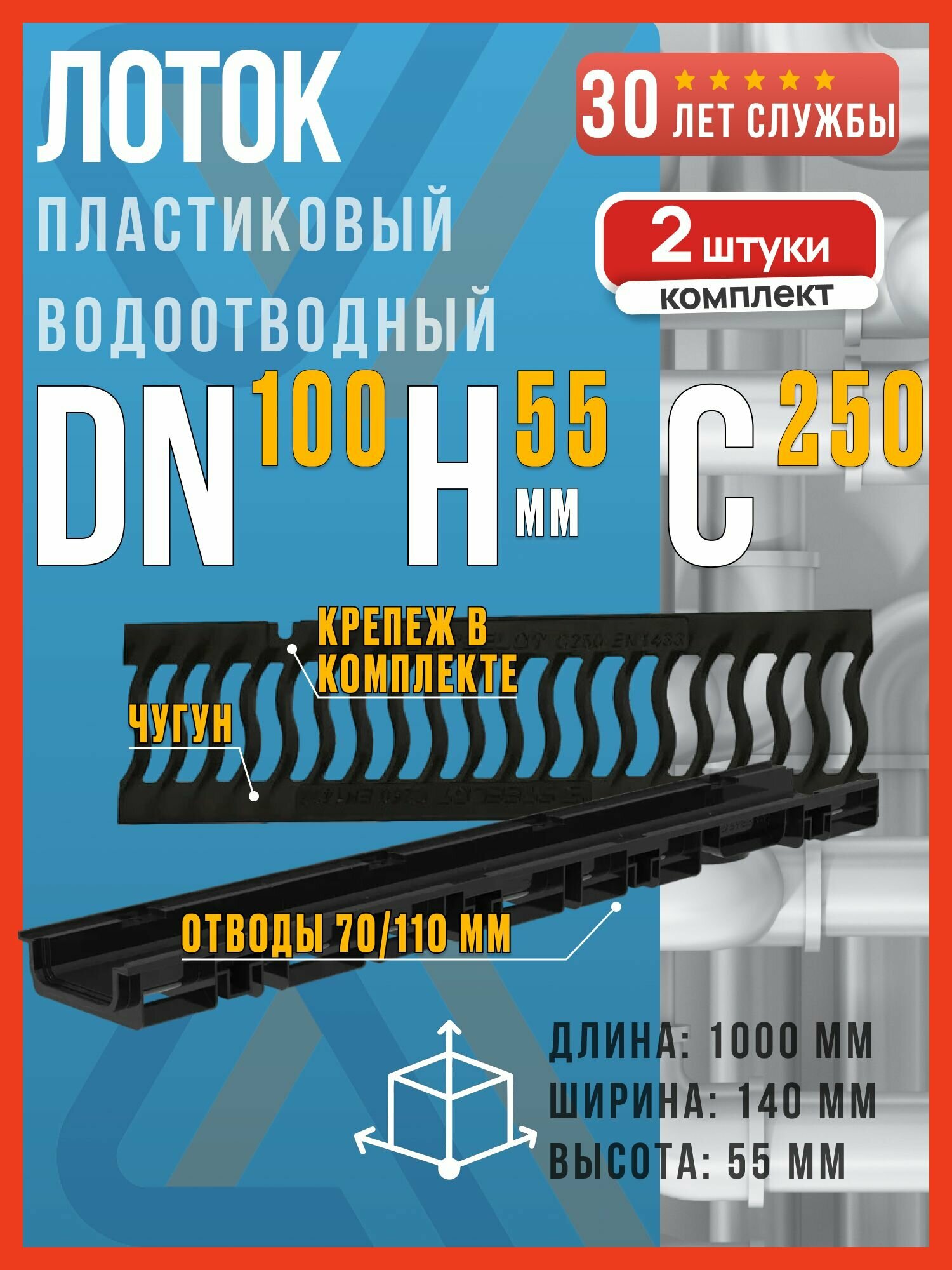 Лоток водоотводный пластиковый SteeStart DN100 H55 (d100 мм, h55 мм) с чугунной решеткой волна класса С250, 2 шт.: сравнение цен, характеристики, фото, актуальное наличие и цены.