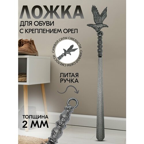 Очень прочная и большая ложка металлическая для обуви с литой ручкой и креплением в виде орла - важный аксессуар для обуви. Она выполнена из высококачественного металла цвета античное серебро и имеет красивую литую ручку ручного производства, что обеспечивает долговечность и надежность в использовании. Общая длина 650 мм, ширина 50 мм, высота 40 мм. Длина ручки 165 мм, длина лопатки 485 мм, толщина 2мм, вес 610 гр Она поможет надевать обувь без трудностей и избегать повреждения задника, что позволит сохранить обувь в надлежащем виде, форме и уберечь ноги от натирания.