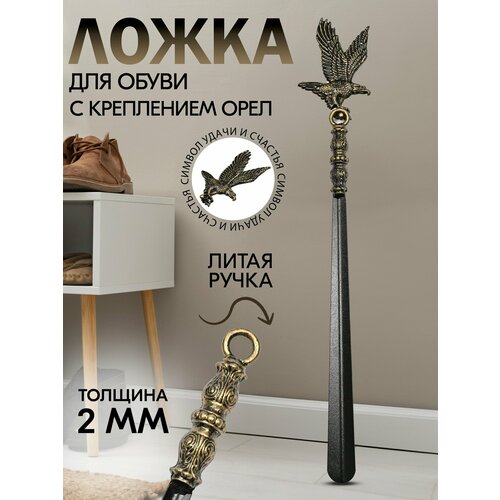 Очень прочная и большая ложка металлическая для обуви с литой ручкой и креплением в виде орла - важный аксессуар для обуви. Она выполнена из высококачественного металла цвета античное золото и имеет красивую литую ручку ручного производства, что обеспечивает долговечность и надежность в использовании. Общая длина 650 мм, ширина 50 мм, высота 40 мм. Длина ручки 165 мм, длина лопатки 485 мм, толщина 2мм, вес 610 гр Она поможет надевать обувь без трудностей и избегать повреждения задника, что позволит сохранить обувь в надлежащем виде, форме и уберечь ноги от натирания.