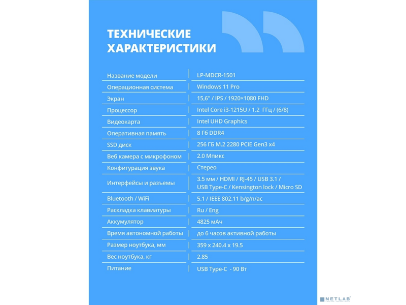 LP-MDCR-1501 15.6″ FHD IPS (Intel i3-1215U(1.3GHz) / 8Gb DDR4 3200MHz (2slot) / 256Gb SSD PCIe /Intel UHD Graphics (support Iris Xe with dual RAM) / RJ45 / W11Pro/4250 mAh /металл+ пластик): сравнение цен, характеристики, фото, актуальное наличие и цены.