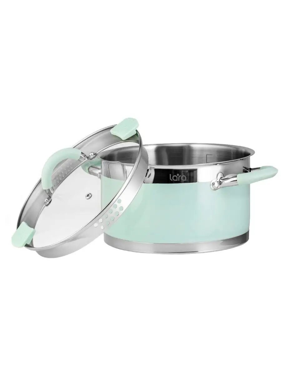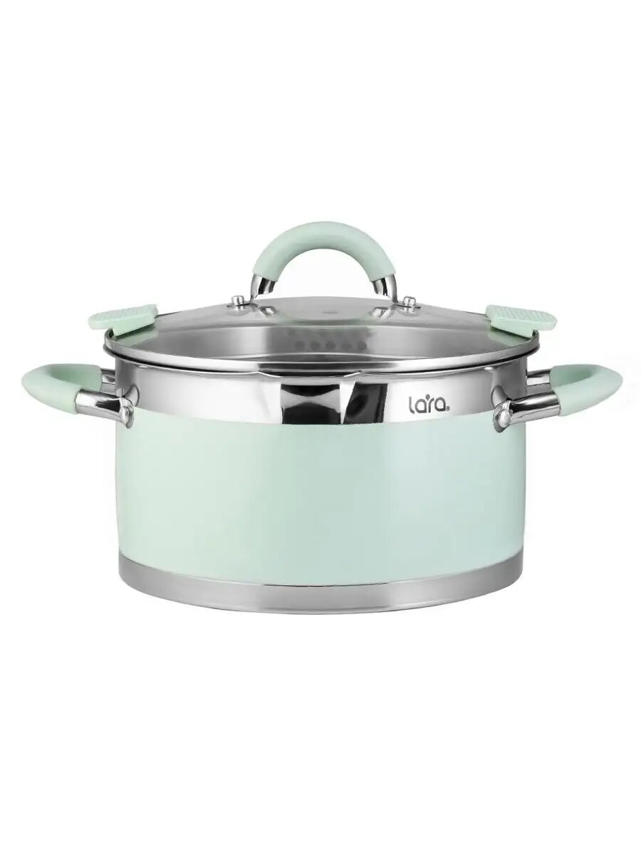 Если не знаете, как освежить интерьер вашей кухни, кастрюли LARA серии «Mint» помогут в этом. Они украсят любую кухню и непременно добавят легкости и свежести. Оригинальный дизайн прямой формы с комбинированной полировкой и отделкой мятного цвета не оставит равнодушной ни одну хозяйку. Кастрюли выполнены из высококачественной нержавеющей стали AISI201, термостойкого стекла и ненагревающегося силикона на ручках. Главной особенностью серии является уникальная конструкция крышки с силиконовыми накладками и отверстиями диаметром 3 и 6 мм для быстрого слива воды. Толстое индукционное капсулированное дно подходит для всех типов плит