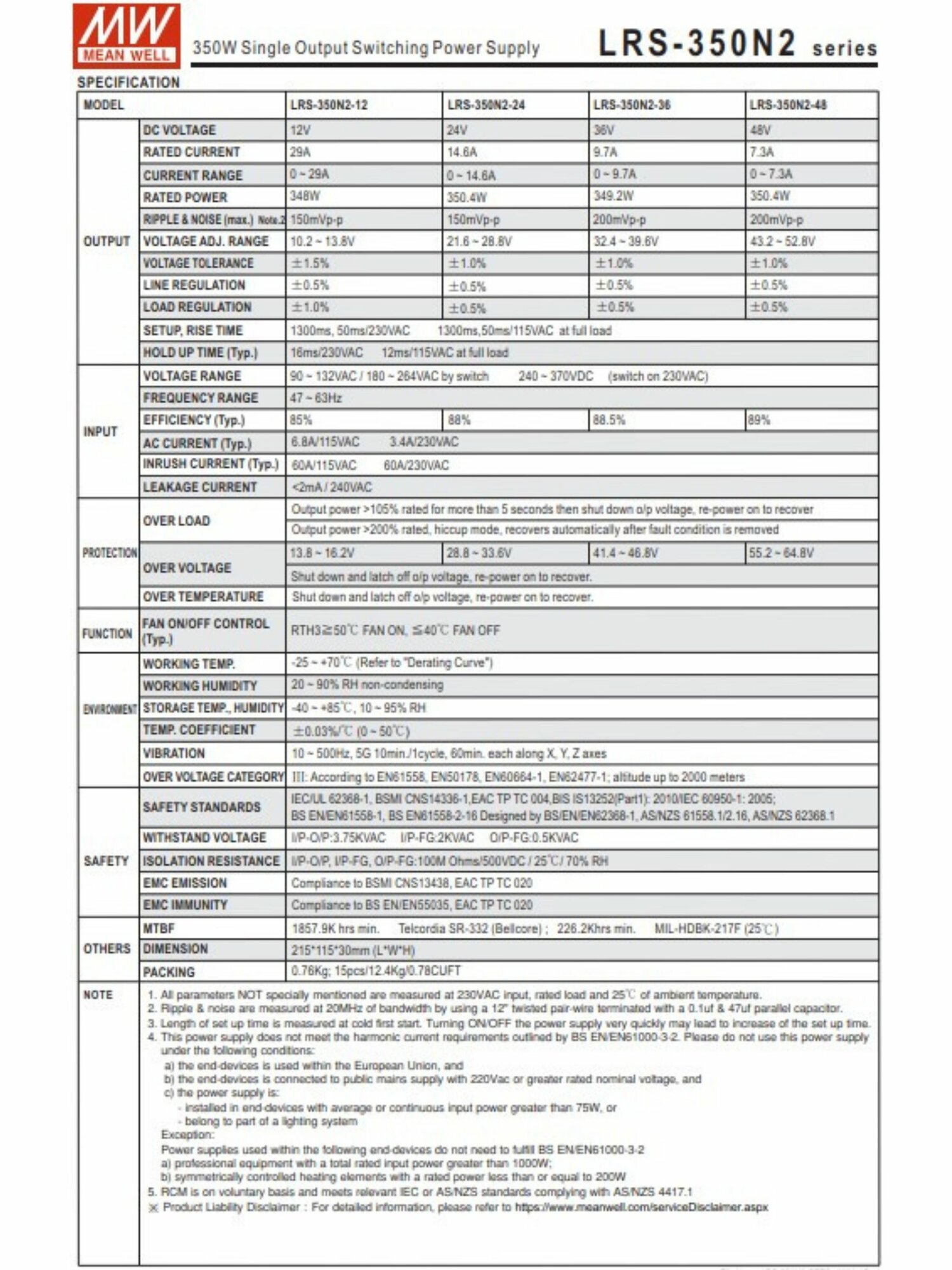 LRS-350N2-48 MEAN WELL Блок питания импульсный 350Вт 48В 7.3А, поддержка пиковой мощности до 700Вт, вход 90-264В: сравнение цен, характеристики, фото, актуальное наличие и цены.