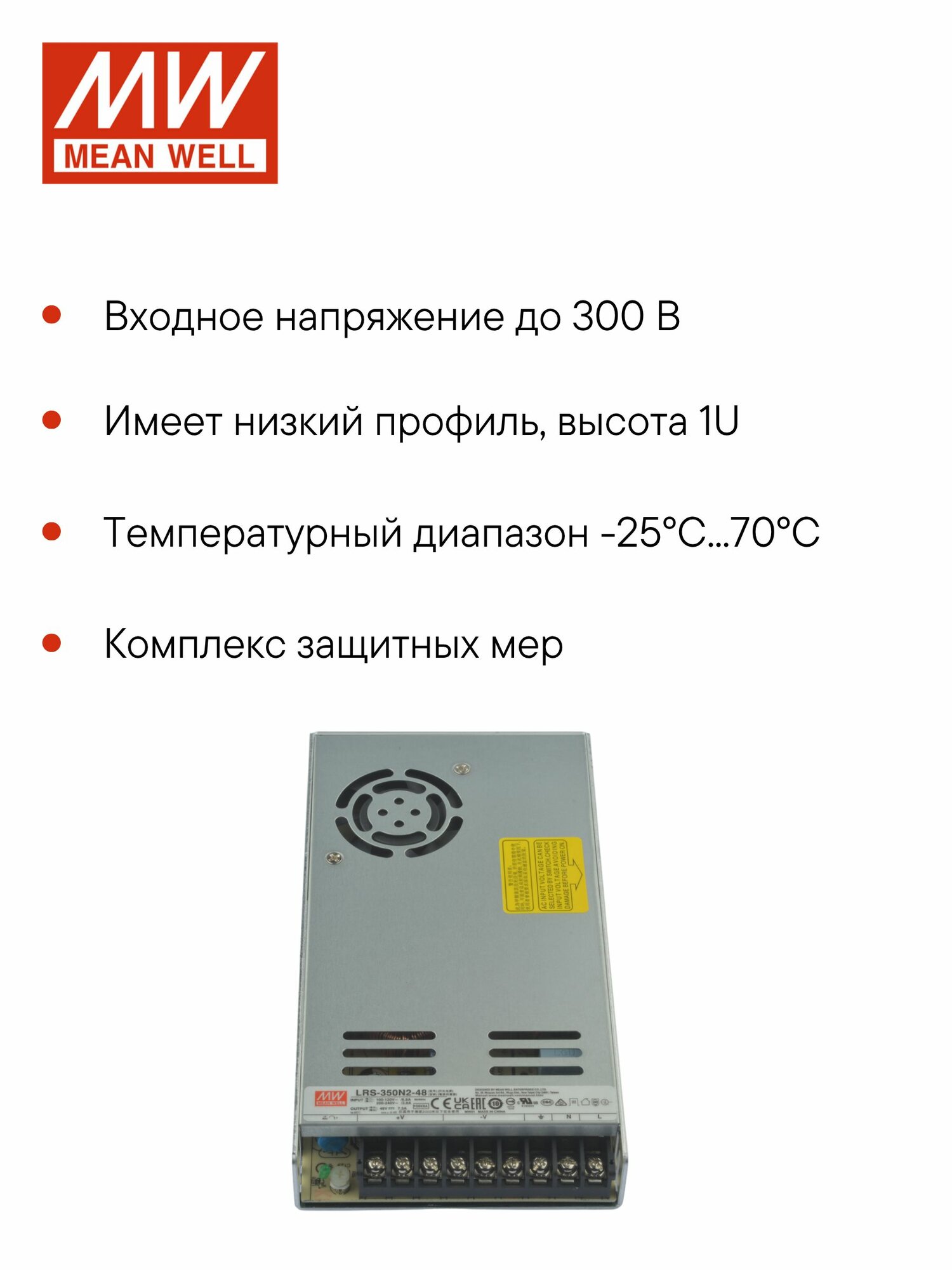 Купить LRS-350N2-48 MEAN WELL Блок питания импульсный 350Вт 48В 7.3А, поддержка пиковой мощности до 700Вт, вход 90-264В с доставкой по всей России.