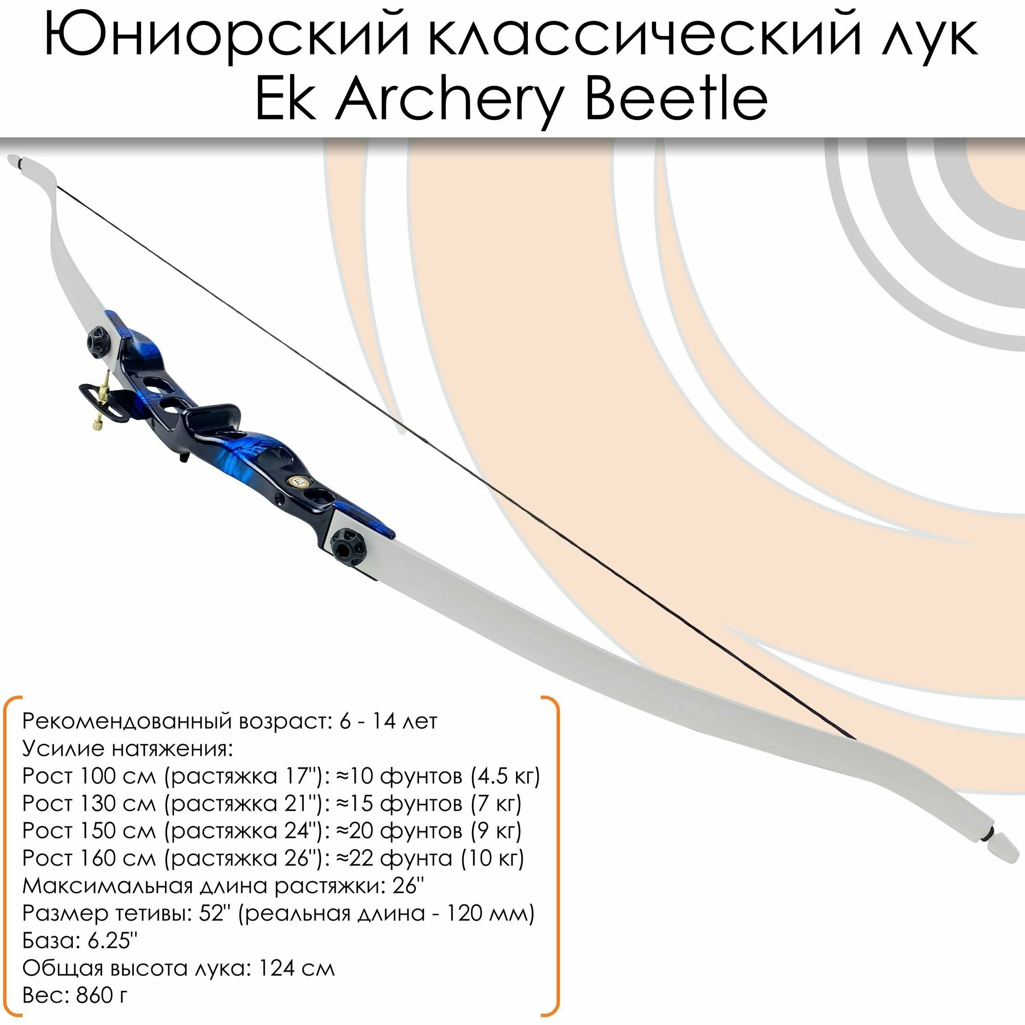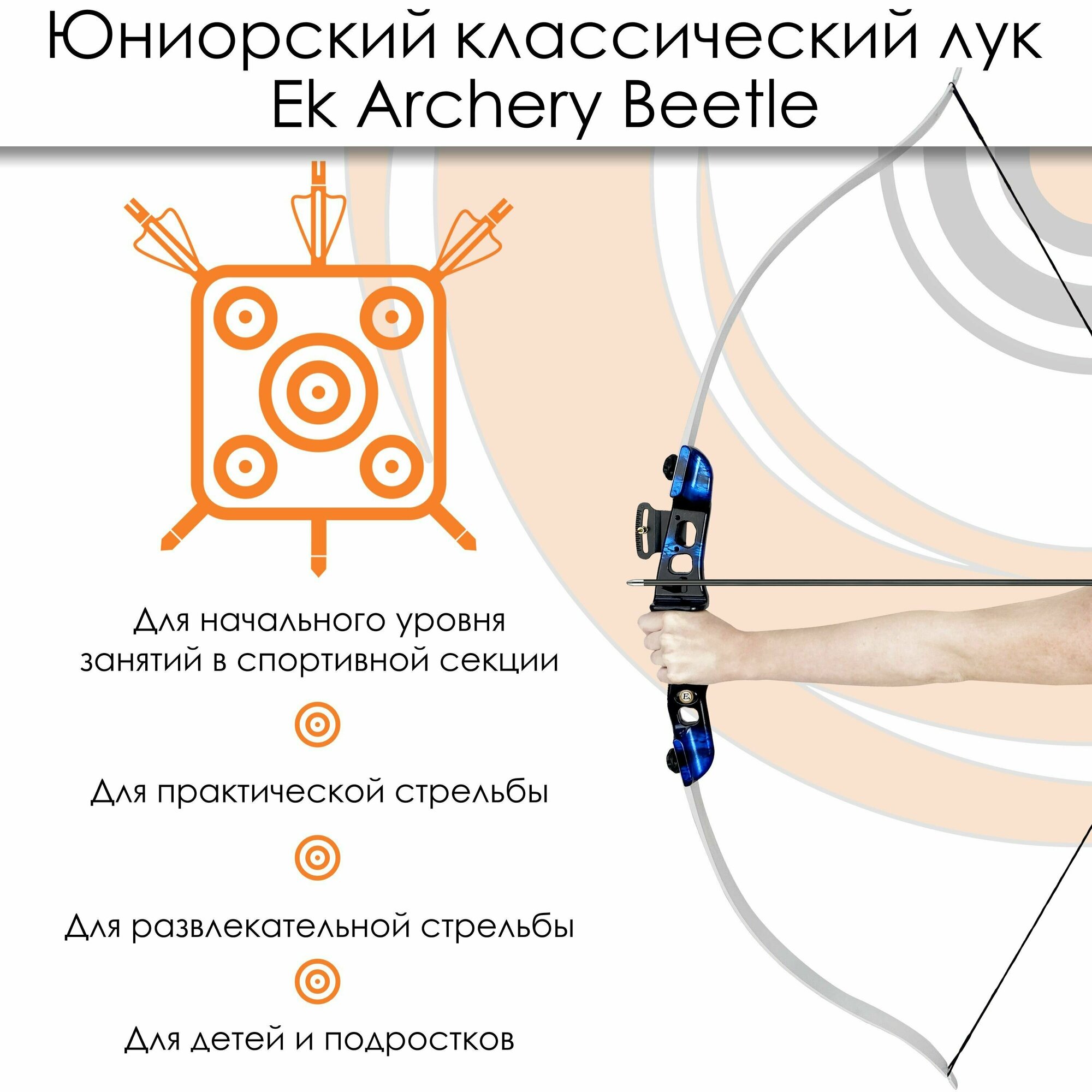 Юниорский классический лук Ek Archery Beetle подходит для использования как детьми, так и подростками. Помимо развлекательной стрельбы, лук Beetle находит применение в спортивных секциях и тирах.