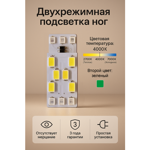 Описание: Если вы любите необычные эффекты, то вам обязательно стоит приобрести двухрежимную светодиодную подсветку ног для вашего автомобиля. Наш модуль включает в себя два режима освещения, которые активируются при разных условиях: зеленый свет включается, когда двери закрыты и включены габаритные огни или ближний свет фар, а белое свечение включается при открытии дверей.