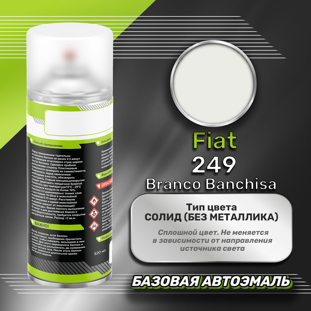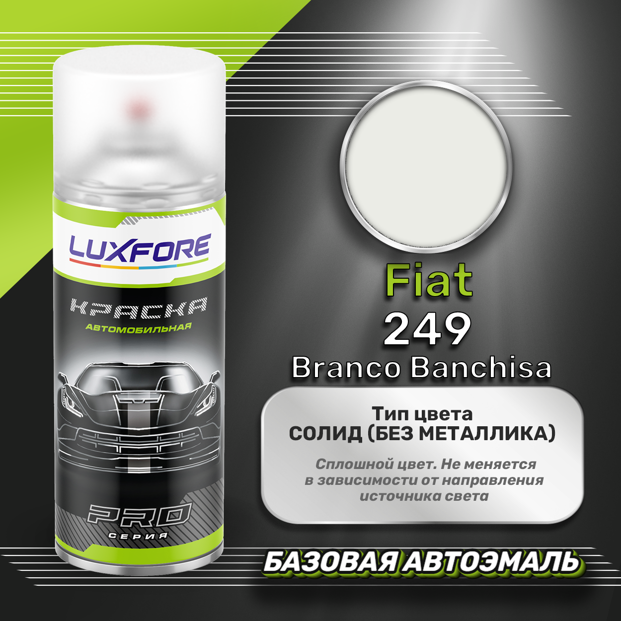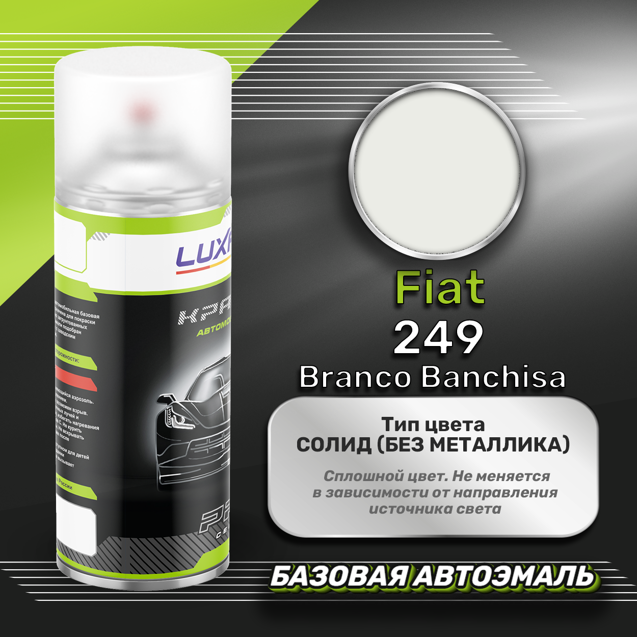 Аэрозольная краска базовая эмаль Luxfore в баллончике 400 мл, по цветовому каталогу Fiat, цвет 249 Branco Banchisa. Премиальная автомобильная краска, обладает высокой укрывистостью и скоростью сушки, что позволит вам: быстро и качественно провести предпродажную подготовку автомобиля, а также выполнить небольшой ремонт лакокрасочного покрытия самостоятельно. Примечание: Внимание! Все базовые автоэмали, не покрытые автомобильным лаком имеют тусклый матовый цвет, а также подвержены воздействию окружающей среды. Помните, что базовые автомобильные краски необходимо обязательно покрывать автомобильным лаком для защиты от воздействия окружающей среды, а также получения законченного глянцевого вида.