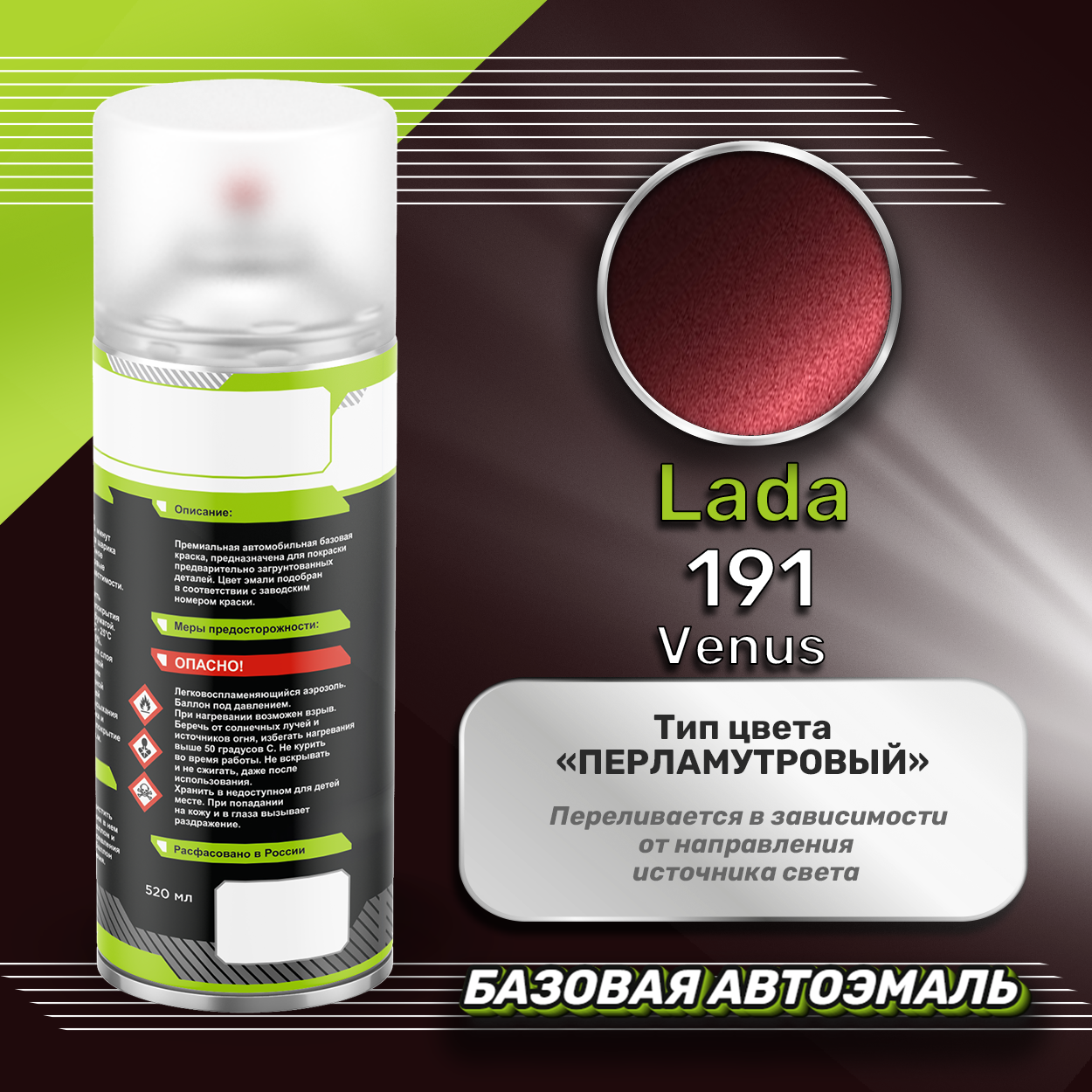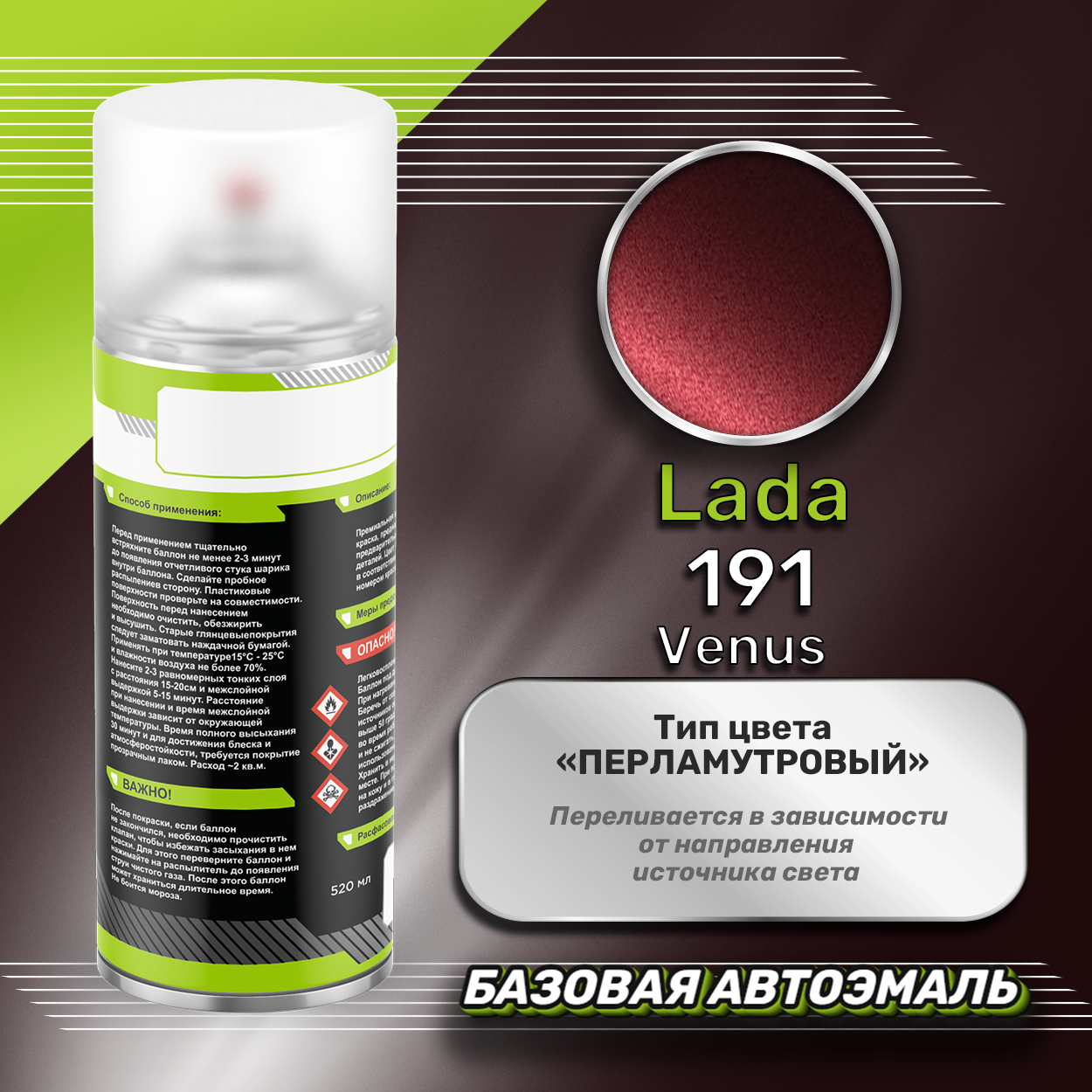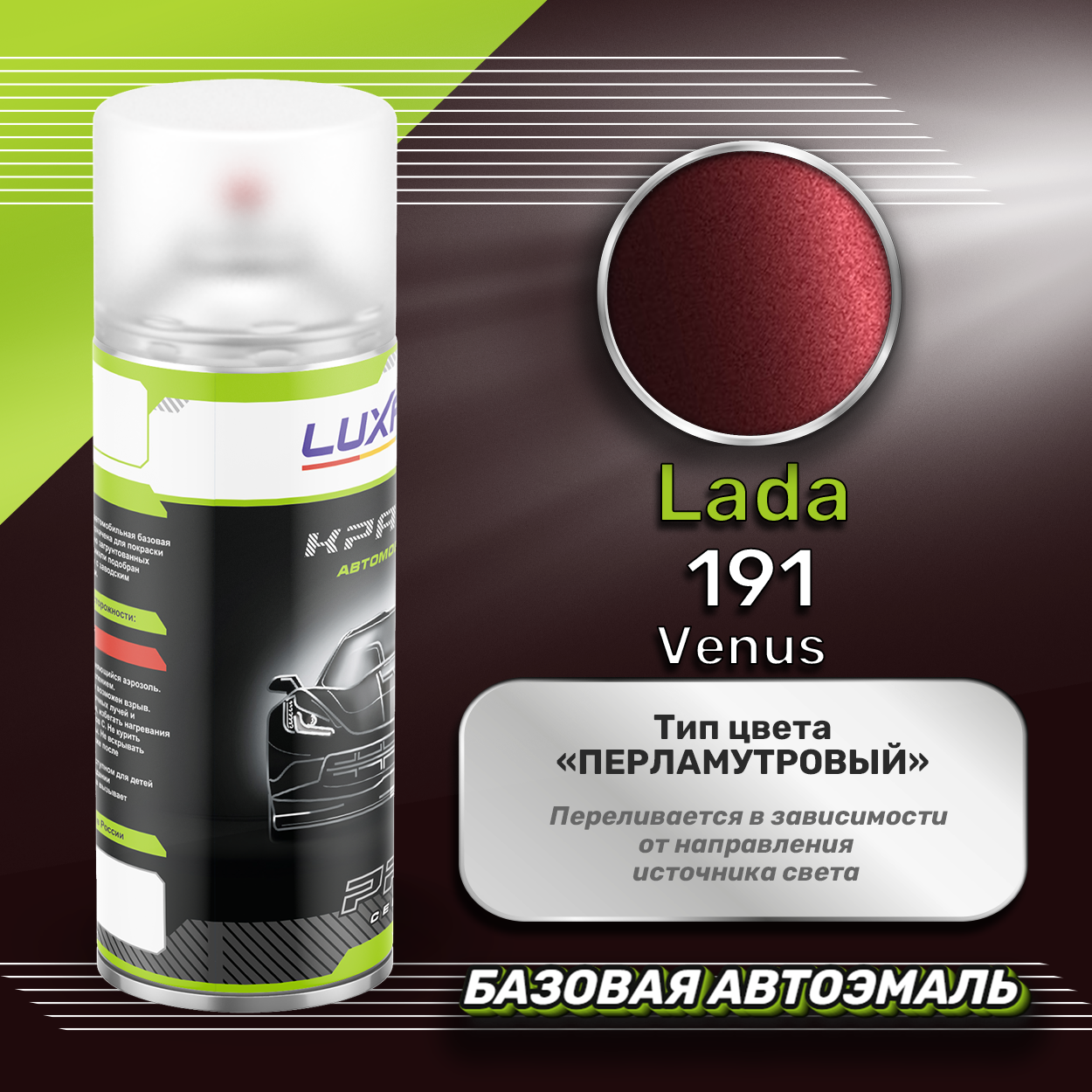 Аэрозольная краска базовая эмаль Luxfore в баллончике 400 мл, по цветовому каталогу LADA, цвет 191 Венера. Премиальная автомобильная краска, обладает высокой укрывистостью и скоростью сушки, что позволит вам: быстро и качественно провести предпродажную подготовку автомобиля, а также выполнить небольшой ремонт лакокрасочного покрытия самостоятельно. Примечание: Внимание! Все базовые автоэмали, не покрытые автомобильным лаком имеют тусклый матовый цвет, а также подвержены воздействию окружающей среды. Помните, что базовые автомобильные краски необходимо обязательно покрывать автомобильным лаком для защиты от воздействия окружающей среды, а также получения законченного глянцевого вида.