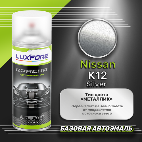 Аэрозольная краска базовая эмаль Luxfore в баллончике 400 мл, по цветовому каталогу Nissan, цвет K12 Silver. Премиальная автомобильная краска, обладает высокой укрывистостью и скоростью сушки, что позволит вам: быстро и качественно провести предпродажную подготовку автомобиля, а также выполнить небольшой ремонт лакокрасочного покрытия самостоятельно. Примечание: Внимание! Все базовые автоэмали, не покрытые автомобильным лаком имеют тусклый матовый цвет, а также подвержены воздействию окружающей среды. Помните, что базовые автомобильные краски необходимо обязательно покрывать автомобильным лаком для защиты от воздействия окружающей среды, а также получения законченного глянцевого вида.