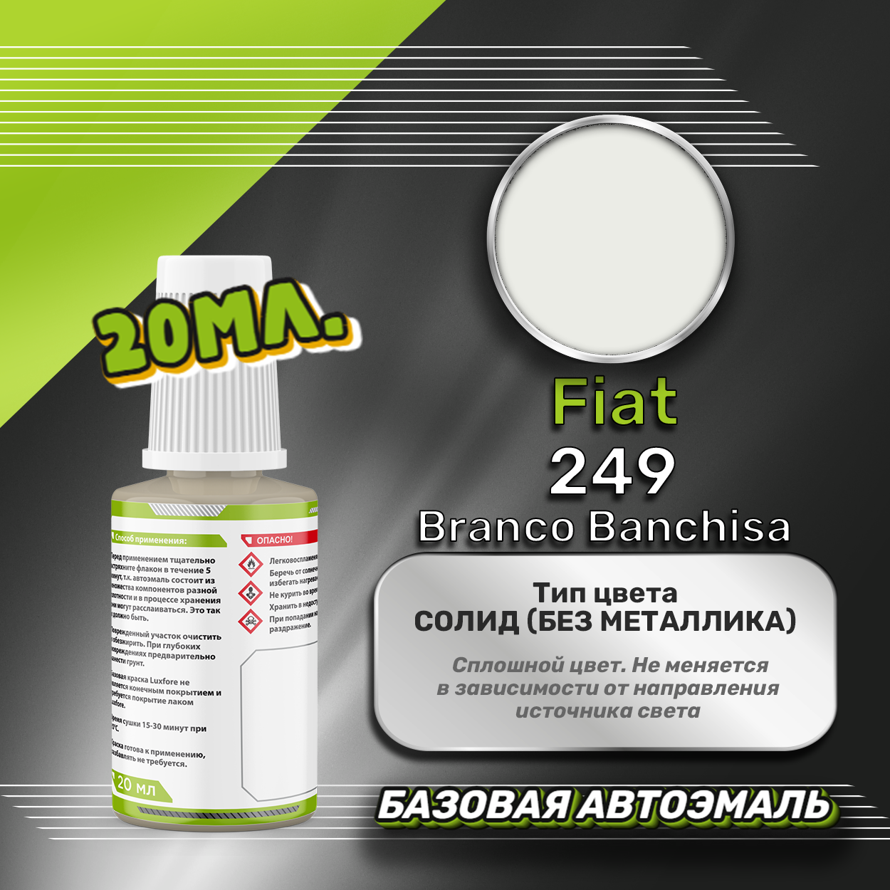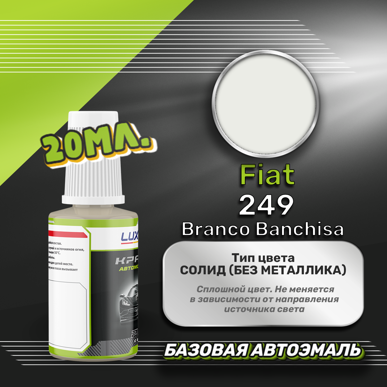 Базовая автоэмаль Luxfore в подкраске с кисточкой объемом 20мл, по цветовому каталогу Fiat, цвет 249 Branco Banchisa. Премиальная автомобильная краска, обладает высокой укрывистостью и скоростью сушки, что позволит вам: быстро и качественно провести предпродажную подготовку автомобиля, а также выполнить небольшой ремонт лакокрасочного покрытия самостоятельно. Примечание: Внимание! Все базовые автоэмали, не покрытые автомобильным лаком имеют тусклый матовый цвет, а также подвержены воздействию окружающей среды. Помните, что базовые автомобильные краски необходимо обязательно покрывать автомобильным лаком для защиты от воздействия окружающей среды, а также получения законченного глянцевого вида.