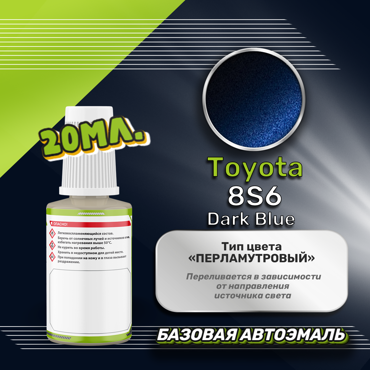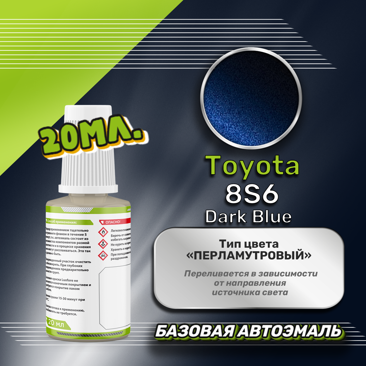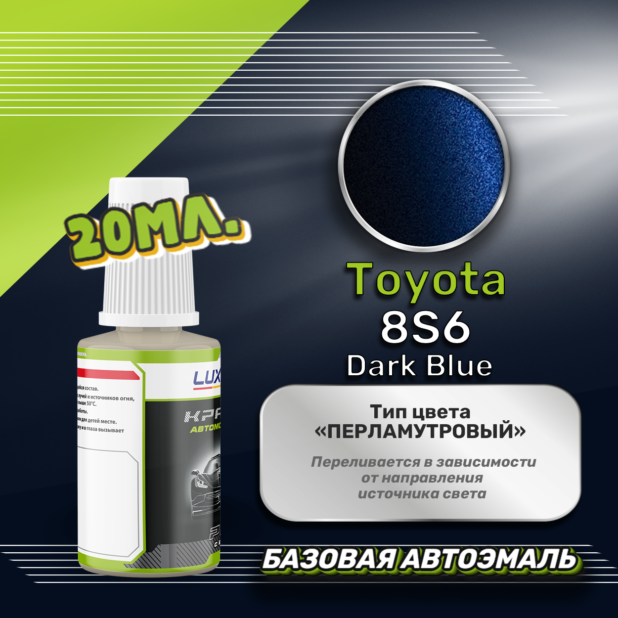 Базовая автоэмаль Luxfore в подкраске с кисточкой объемом 20мл, по цветовому каталогу Toyota, цвет 8S6 Dark Blue. Премиальная автомобильная краска, обладает высокой укрывистостью и скоростью сушки, что позволит вам: быстро и качественно провести предпродажную подготовку автомобиля, а также выполнить небольшой ремонт лакокрасочного покрытия самостоятельно. Примечание: Внимание! Все базовые автоэмали, не покрытые автомобильным лаком имеют тусклый матовый цвет, а также подвержены воздействию окружающей среды. Помните, что базовые автомобильные краски необходимо обязательно покрывать автомобильным лаком для защиты от воздействия окружающей среды, а также получения законченного глянцевого вида.