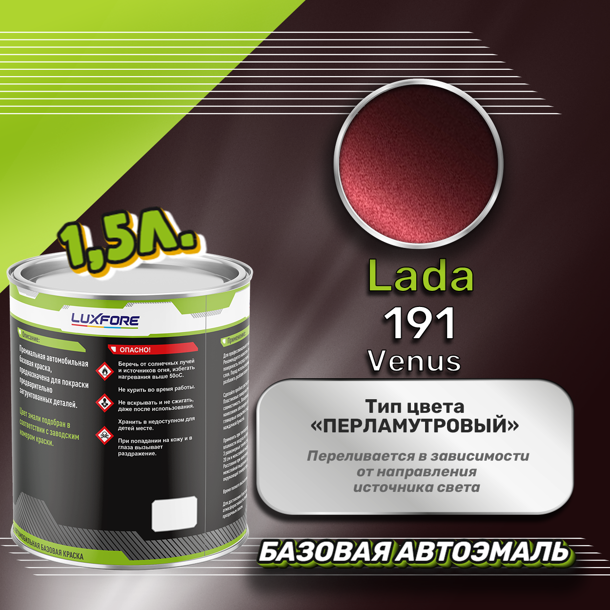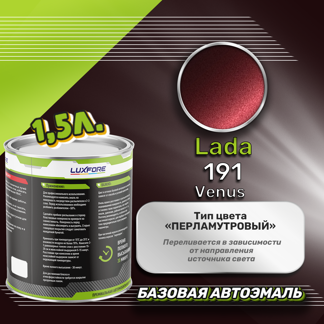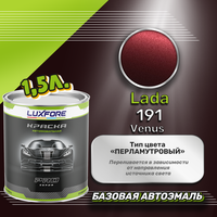 Базовая автоэмаль Luxfore в банке объемом 1500 мл, по цветовому каталогу LADA, цвет 191 Венера. Премиальная автомобильная краска, обладает высокой укрывистостью и скоростью сушки, что позволит вам: быстро и качественно провести предпродажную подготовку автомобиля, а также выполнить небольшой ремонт лакокрасочного покрытия самостоятельно. Примечание: Внимание! Все базовые автоэмали, не покрытые автомобильным лаком имеют тусклый матовый цвет, а также подвержены воздействию окружающей среды. Помните, что базовые автомобильные краски необходимо обязательно покрывать автомобильным лаком для защиты от воздействия окружающей среды, а также получения законченного глянцевого вида.