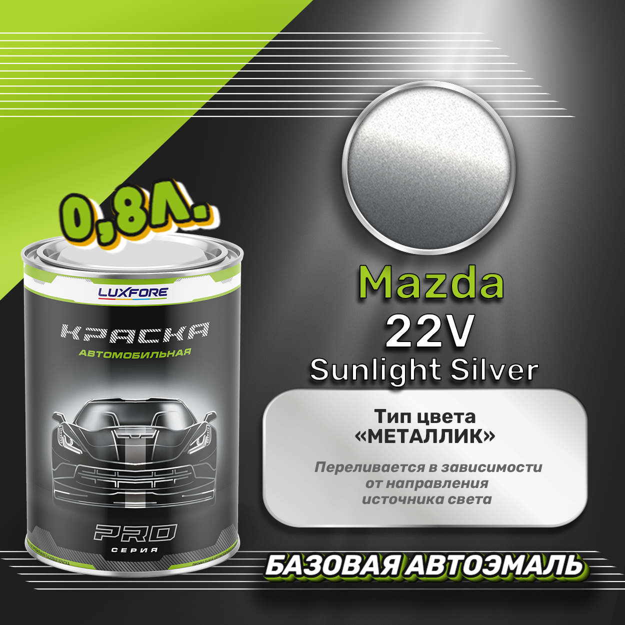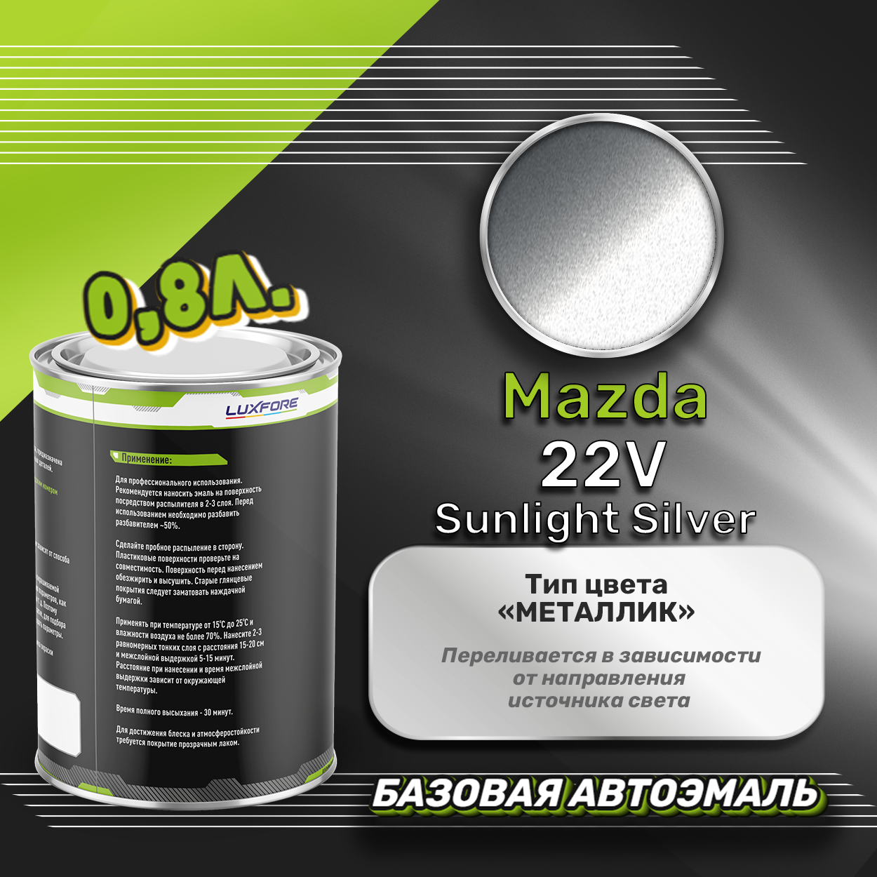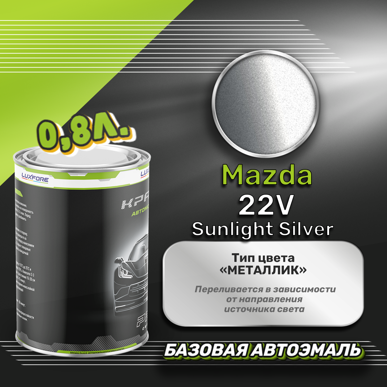 Базовая автоэмаль Luxfore в банке объемом 800 мл, по цветовому каталогу Mazda, цвет 22V Sunlight Silver. Премиальная автомобильная краска, обладает высокой укрывистостью и скоростью сушки, что позволит вам: быстро и качественно провести предпродажную подготовку автомобиля, а также выполнить небольшой ремонт лакокрасочного покрытия самостоятельно. Примечание: Внимание! Все базовые автоэмали, не покрытые автомобильным лаком имеют тусклый матовый цвет, а также подвержены воздействию окружающей среды. Помните, что базовые автомобильные краски необходимо обязательно покрывать автомобильным лаком для защиты от воздействия окружающей среды, а также получения законченного глянцевого вида.