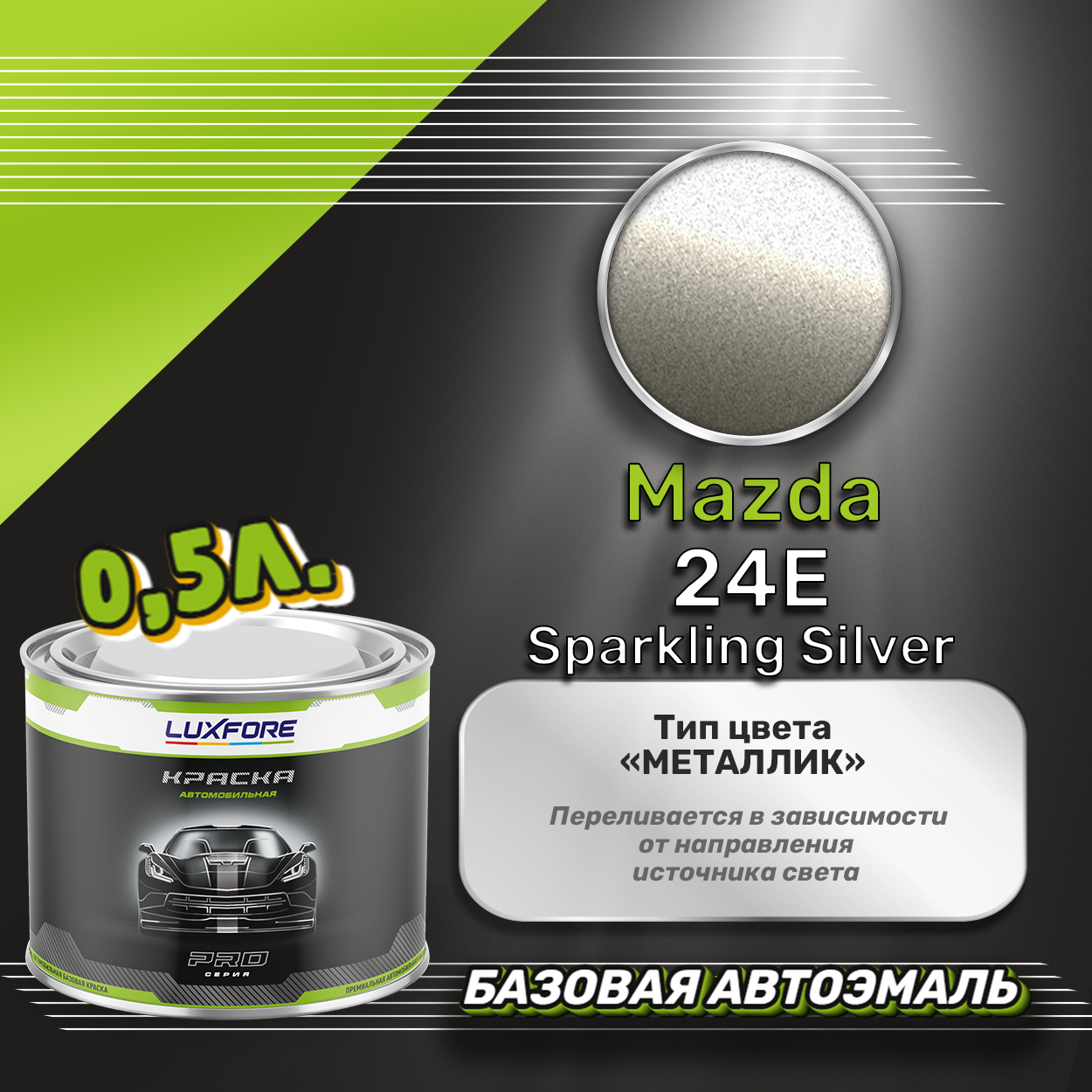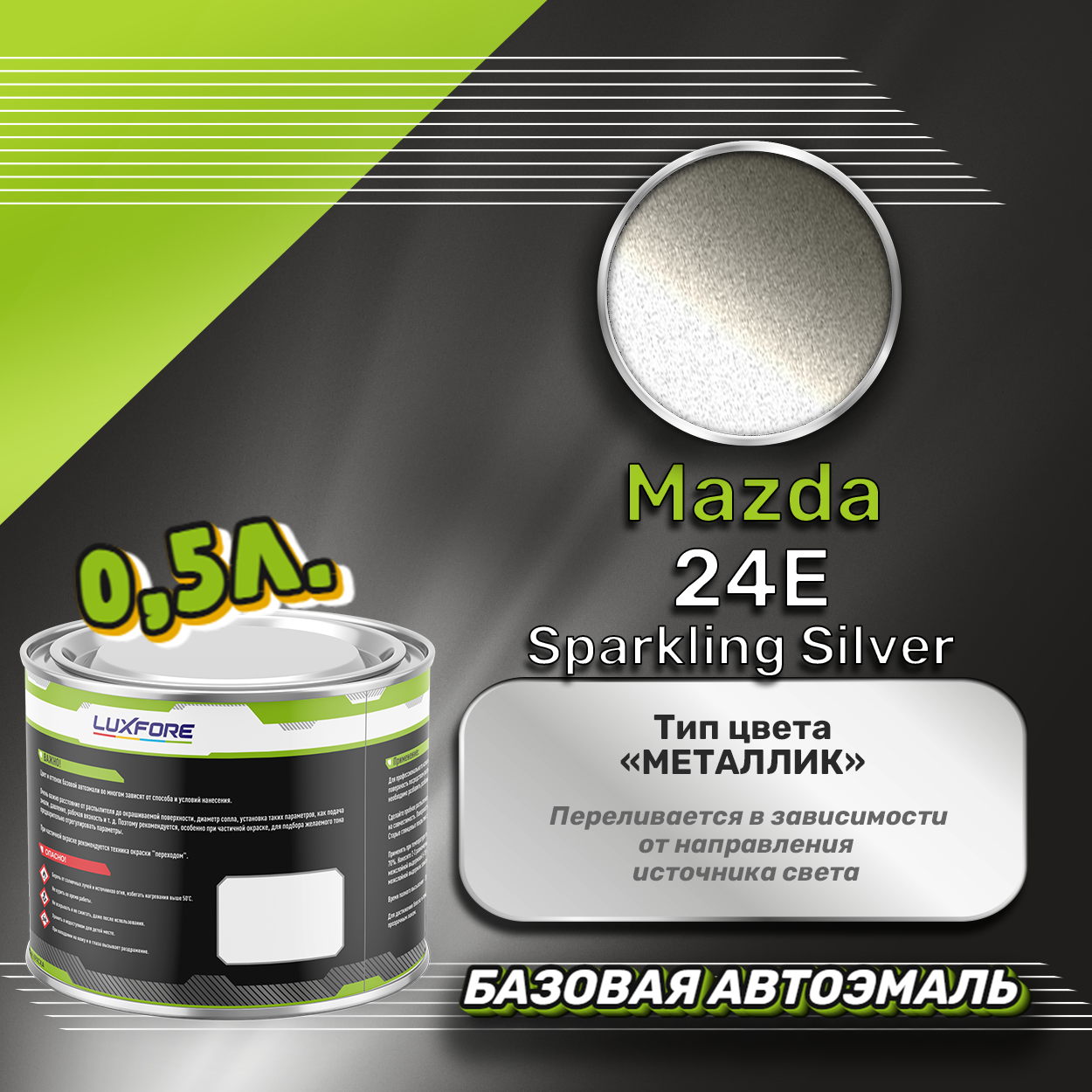 Базовая автоэмаль Luxfore в банке объемом 500 мл, по цветовому каталогу Mazda, цвет 24E Sparkling Silver. Премиальная автомобильная краска, обладает высокой укрывистостью и скоростью сушки, что позволит вам: быстро и качественно провести предпродажную подготовку автомобиля, а также выполнить небольшой ремонт лакокрасочного покрытия самостоятельно. Примечание: Внимание! Все базовые автоэмали, не покрытые автомобильным лаком имеют тусклый матовый цвет, а также подвержены воздействию окружающей среды. Помните, что базовые автомобильные краски необходимо обязательно покрывать автомобильным лаком для защиты от воздействия окружающей среды, а также получения законченного глянцевого вида.