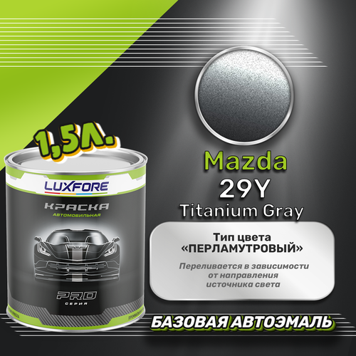 Базовая автоэмаль Luxfore в банке объемом 1500 мл, по цветовому каталогу Mazda, цвет 29Y Titanium Gray. Премиальная автомобильная краска, обладает высокой укрывистостью и скоростью сушки, что позволит вам: быстро и качественно провести предпродажную подготовку автомобиля, а также выполнить небольшой ремонт лакокрасочного покрытия самостоятельно. Примечание: Внимание! Все базовые автоэмали, не покрытые автомобильным лаком имеют тусклый матовый цвет, а также подвержены воздействию окружающей среды. Помните, что базовые автомобильные краски необходимо обязательно покрывать автомобильным лаком для защиты от воздействия окружающей среды, а также получения законченного глянцевого вида.