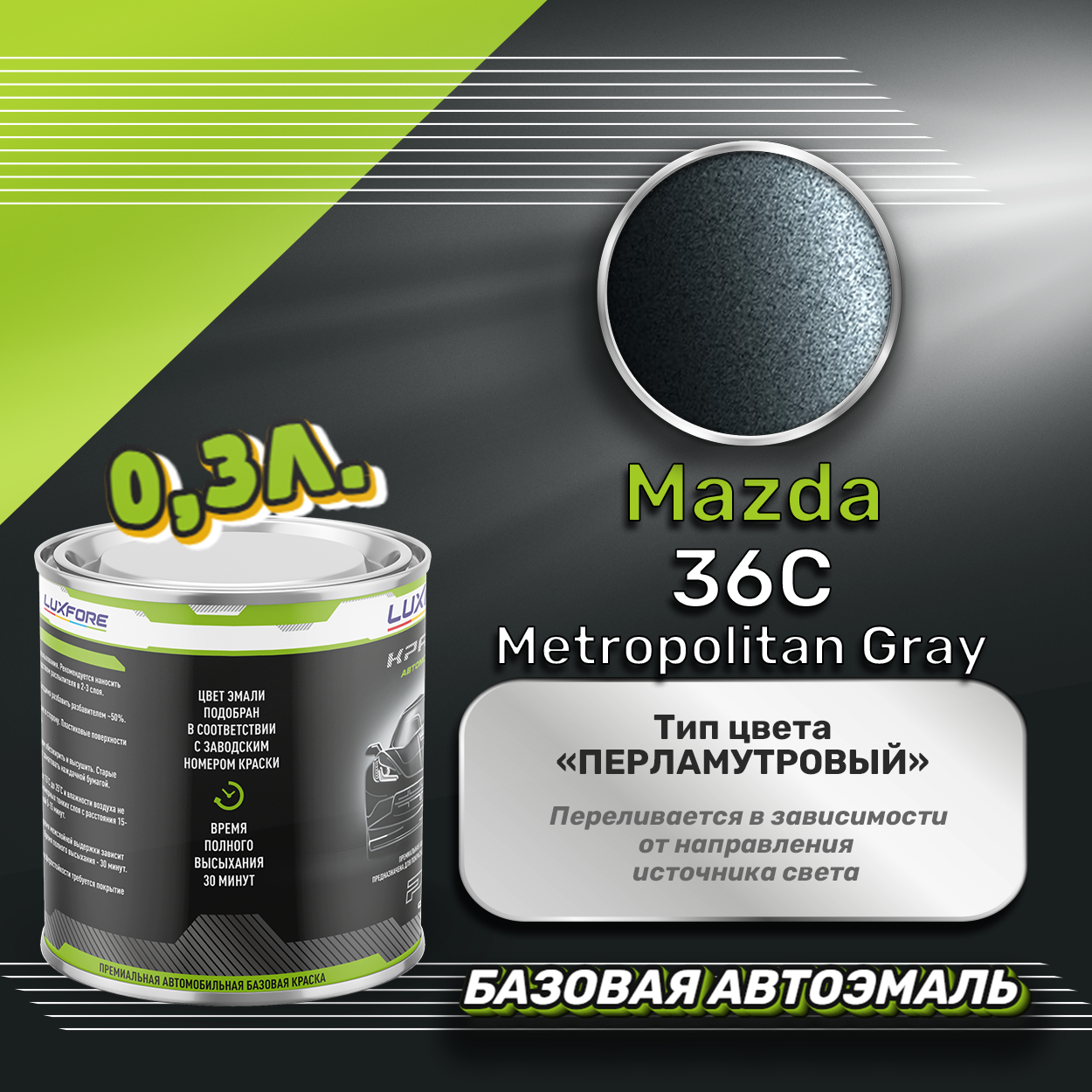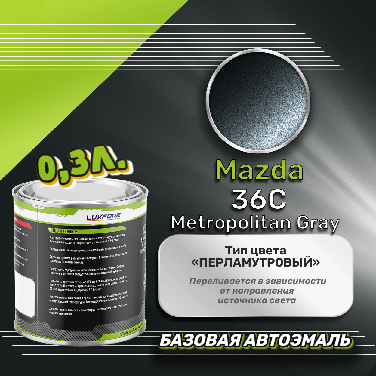 Базовая автоэмаль Luxfore в банке объемом 300 мл, по цветовому каталогу Mazda, цвет 36C Metropolitan Gray. Премиальная автомобильная краска, обладает высокой укрывистостью и скоростью сушки, что позволит вам: быстро и качественно провести предпродажную подготовку автомобиля, а также выполнить небольшой ремонт лакокрасочного покрытия самостоятельно. Примечание: Внимание! Все базовые автоэмали, не покрытые автомобильным лаком имеют тусклый матовый цвет, а также подвержены воздействию окружающей среды. Помните, что базовые автомобильные краски необходимо обязательно покрывать автомобильным лаком для защиты от воздействия окружающей среды, а также получения законченного глянцевого вида.