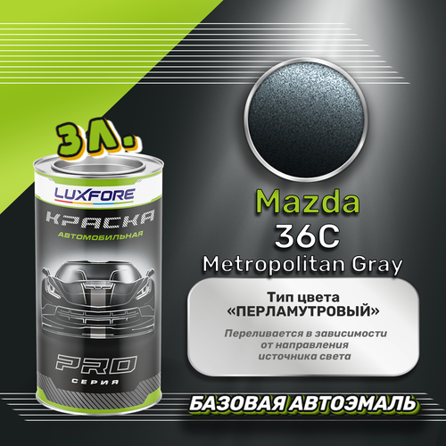 Базовая автоэмаль Luxfore в банке объемом 3000 мл, по цветовому каталогу Mazda, цвет 36C Metropolitan Gray. Премиальная автомобильная краска, обладает высокой укрывистостью и скоростью сушки, что позволит вам: быстро и качественно провести предпродажную подготовку автомобиля, а также выполнить небольшой ремонт лакокрасочного покрытия самостоятельно. Примечание: Внимание! Все базовые автоэмали, не покрытые автомобильным лаком имеют тусклый матовый цвет, а также подвержены воздействию окружающей среды. Помните, что базовые автомобильные краски необходимо обязательно покрывать автомобильным лаком для защиты от воздействия окружающей среды, а также получения законченного глянцевого вида.