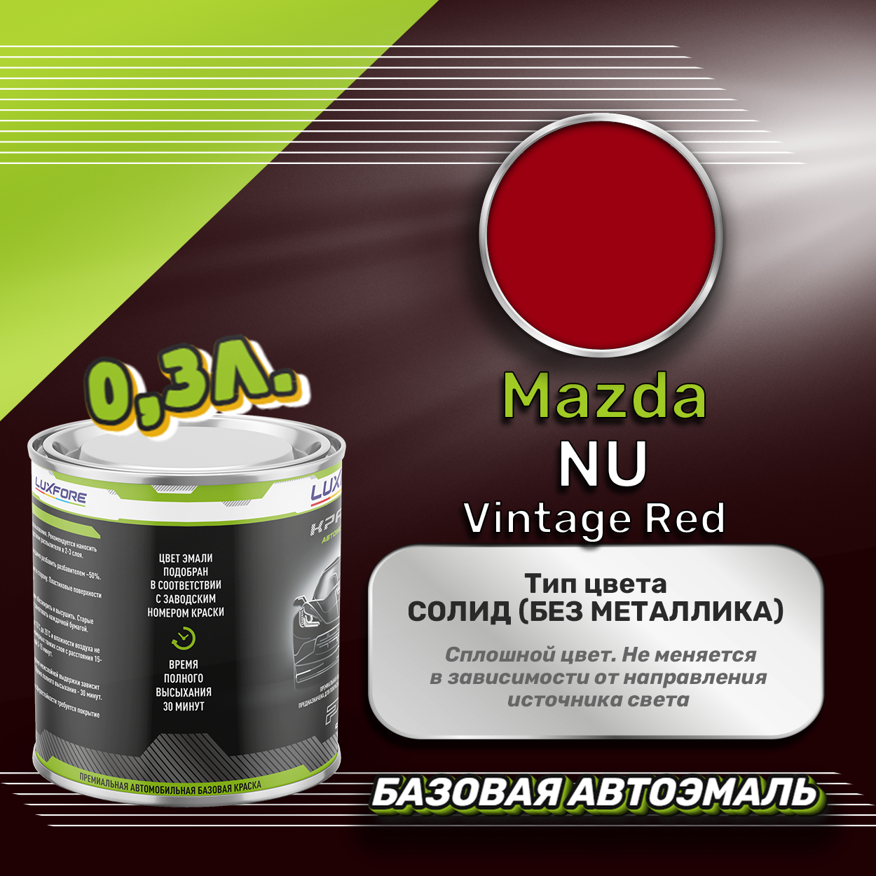 Базовая автоэмаль Luxfore в банке объемом 300 мл, по цветовому каталогу Mazda, цвет NU Vintage Red. Премиальная автомобильная краска, обладает высокой укрывистостью и скоростью сушки, что позволит вам: быстро и качественно провести предпродажную подготовку автомобиля, а также выполнить небольшой ремонт лакокрасочного покрытия самостоятельно. Примечание: Внимание! Все базовые автоэмали, не покрытые автомобильным лаком имеют тусклый матовый цвет, а также подвержены воздействию окружающей среды. Помните, что базовые автомобильные краски необходимо обязательно покрывать автомобильным лаком для защиты от воздействия окружающей среды, а также получения законченного глянцевого вида.