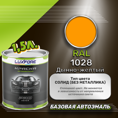 Базовая автоэмаль Luxfore в банке объемом 1500 мл, по цветовому каталогу RAL, цвет 1028 Дынно-желтый. Премиальная автомобильная краска, обладает высокой укрывистостью и скоростью сушки, что позволит вам: быстро и качественно провести предпродажную подготовку автомобиля, а также выполнить небольшой ремонт лакокрасочного покрытия самостоятельно. Примечание: Внимание! Все базовые автоэмали, не покрытые автомобильным лаком имеют тусклый матовый цвет, а также подвержены воздействию окружающей среды. Помните, что базовые автомобильные краски необходимо обязательно покрывать автомобильным лаком для защиты от воздействия окружающей среды, а также получения законченного глянцевого вида.