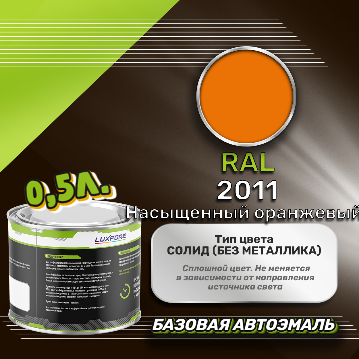 Базовая автоэмаль Luxfore в банке объемом 500 мл, по цветовому каталогу RAL, цвет 2011 Насыщенный оранжевый. Премиальная автомобильная краска, обладает высокой укрывистостью и скоростью сушки, что позволит вам: быстро и качественно провести предпродажную подготовку автомобиля, а также выполнить небольшой ремонт лакокрасочного покрытия самостоятельно. Примечание: Внимание! Все базовые автоэмали, не покрытые автомобильным лаком имеют тусклый матовый цвет, а также подвержены воздействию окружающей среды. Помните, что базовые автомобильные краски необходимо обязательно покрывать автомобильным лаком для защиты от воздействия окружающей среды, а также получения законченного глянцевого вида.