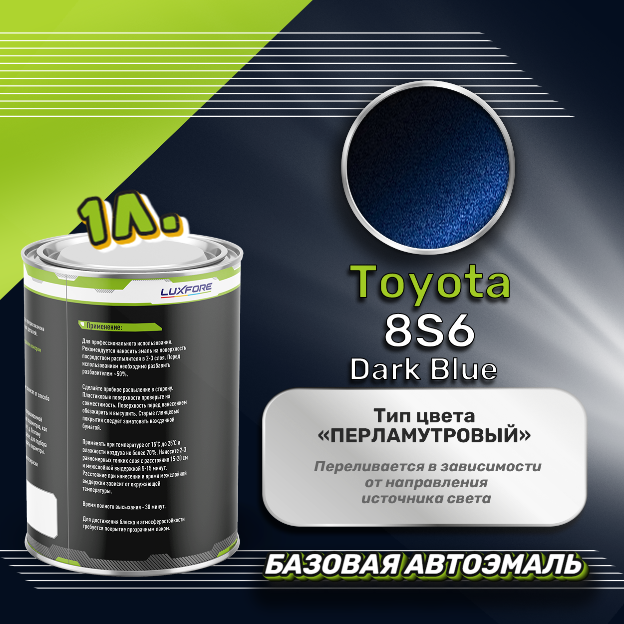 Базовая автоэмаль Luxfore в банке объемом 1000 мл, по цветовому каталогу Toyota, цвет 8S6 Dark Blue. Премиальная автомобильная краска, обладает высокой укрывистостью и скоростью сушки, что позволит вам: быстро и качественно провести предпродажную подготовку автомобиля, а также выполнить небольшой ремонт лакокрасочного покрытия самостоятельно. Примечание: Внимание! Все базовые автоэмали, не покрытые автомобильным лаком имеют тусклый матовый цвет, а также подвержены воздействию окружающей среды. Помните, что базовые автомобильные краски необходимо обязательно покрывать автомобильным лаком для защиты от воздействия окружающей среды, а также получения законченного глянцевого вида.