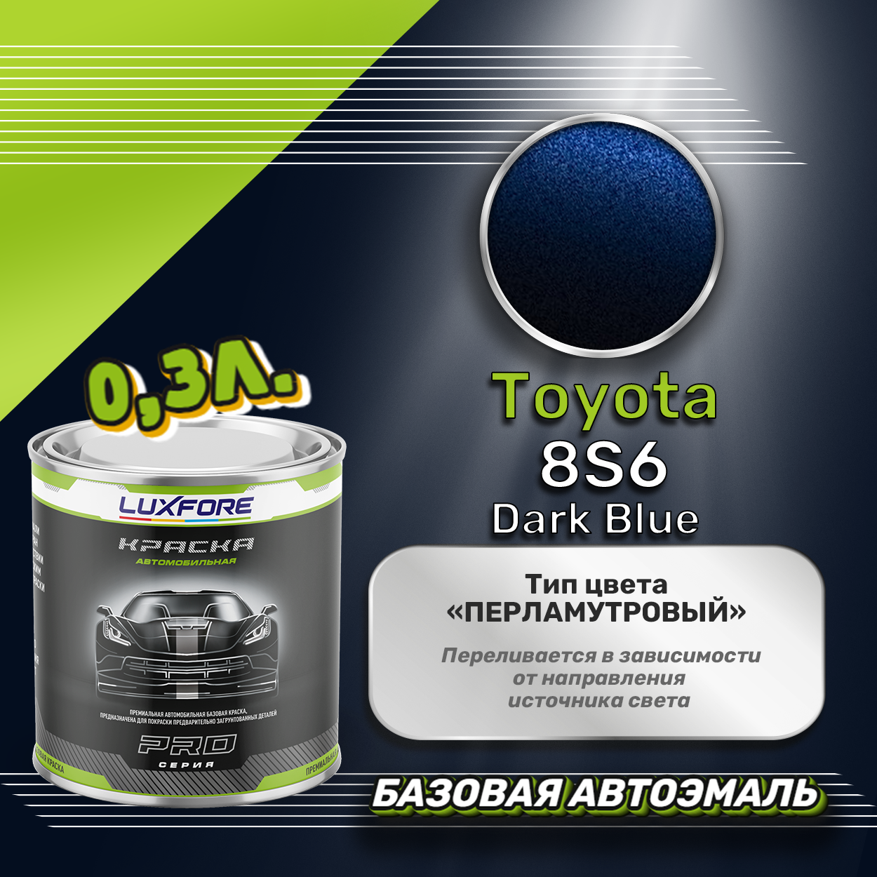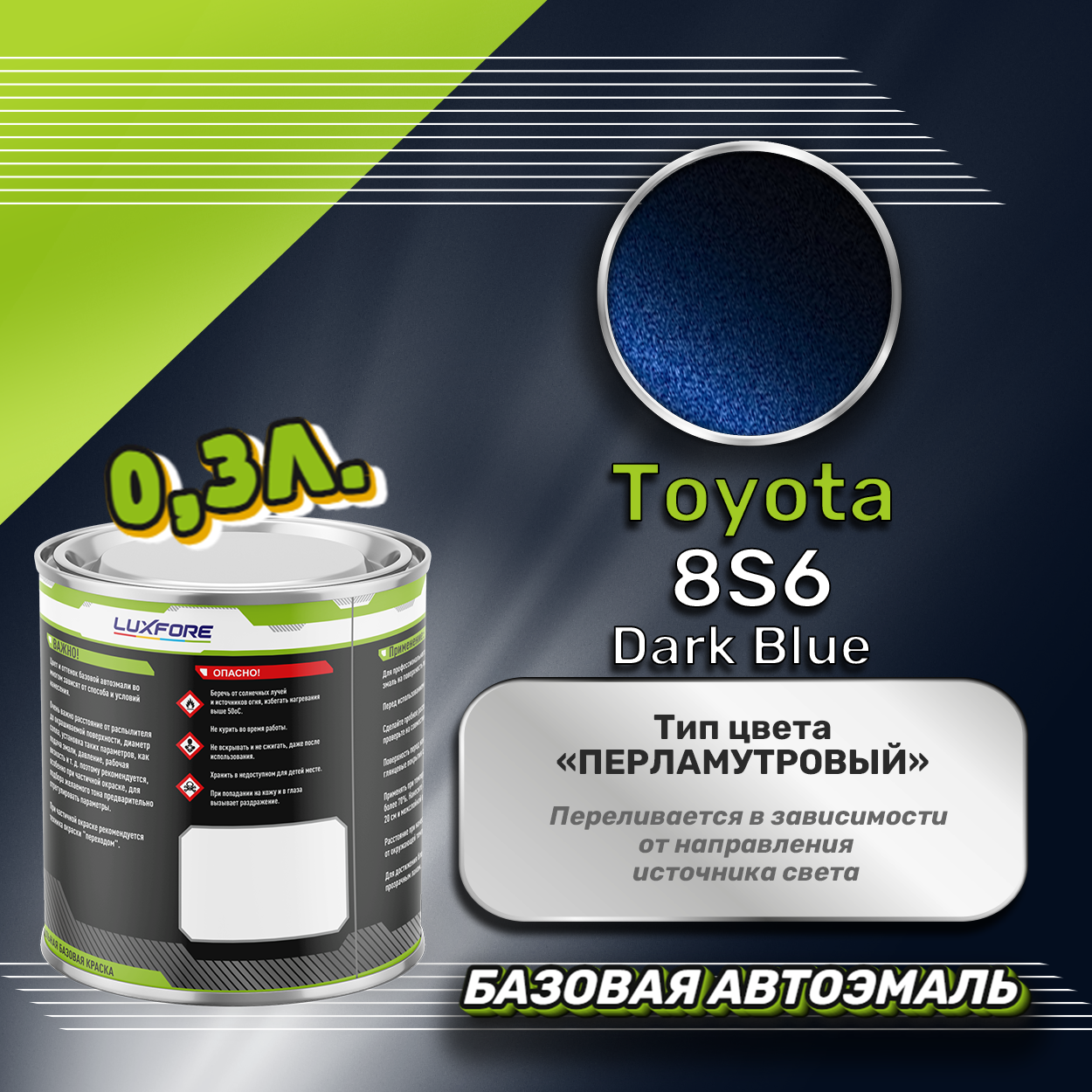 Базовая автоэмаль Luxfore в банке объемом 300 мл, по цветовому каталогу Toyota, цвет 8S6 Dark Blue. Премиальная автомобильная краска, обладает высокой укрывистостью и скоростью сушки, что позволит вам: быстро и качественно провести предпродажную подготовку автомобиля, а также выполнить небольшой ремонт лакокрасочного покрытия самостоятельно. Примечание: Внимание! Все базовые автоэмали, не покрытые автомобильным лаком имеют тусклый матовый цвет, а также подвержены воздействию окружающей среды. Помните, что базовые автомобильные краски необходимо обязательно покрывать автомобильным лаком для защиты от воздействия окружающей среды, а также получения законченного глянцевого вида.