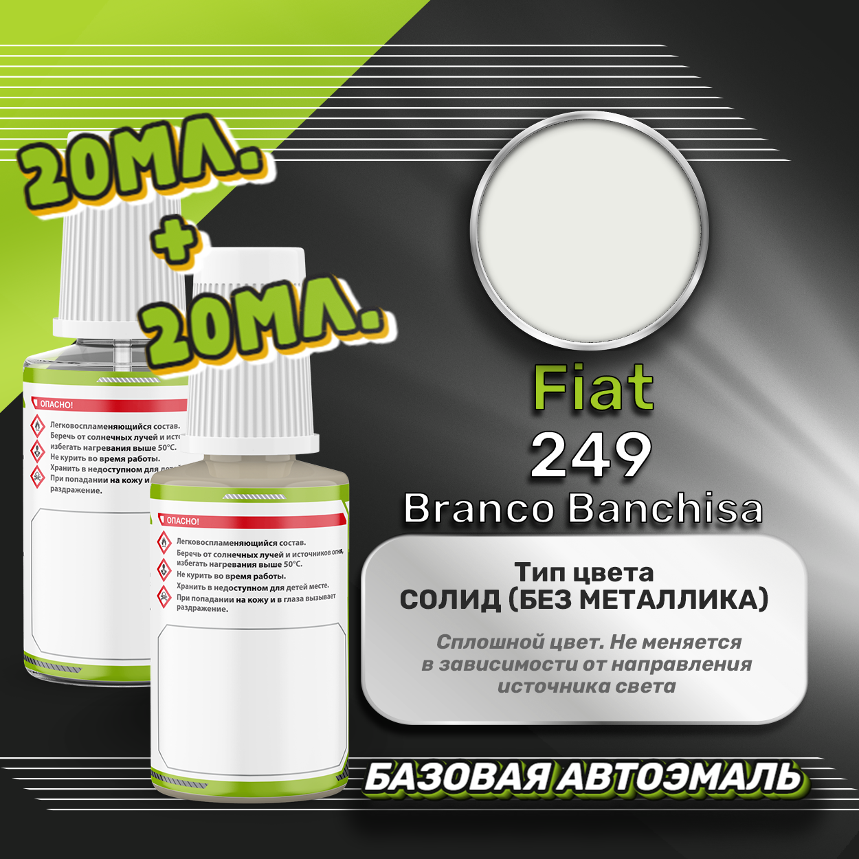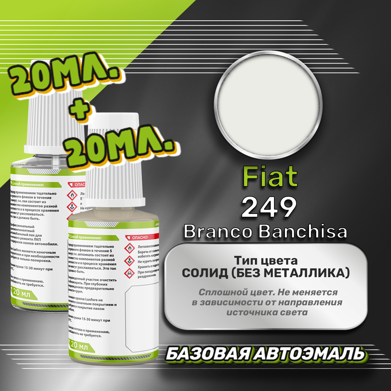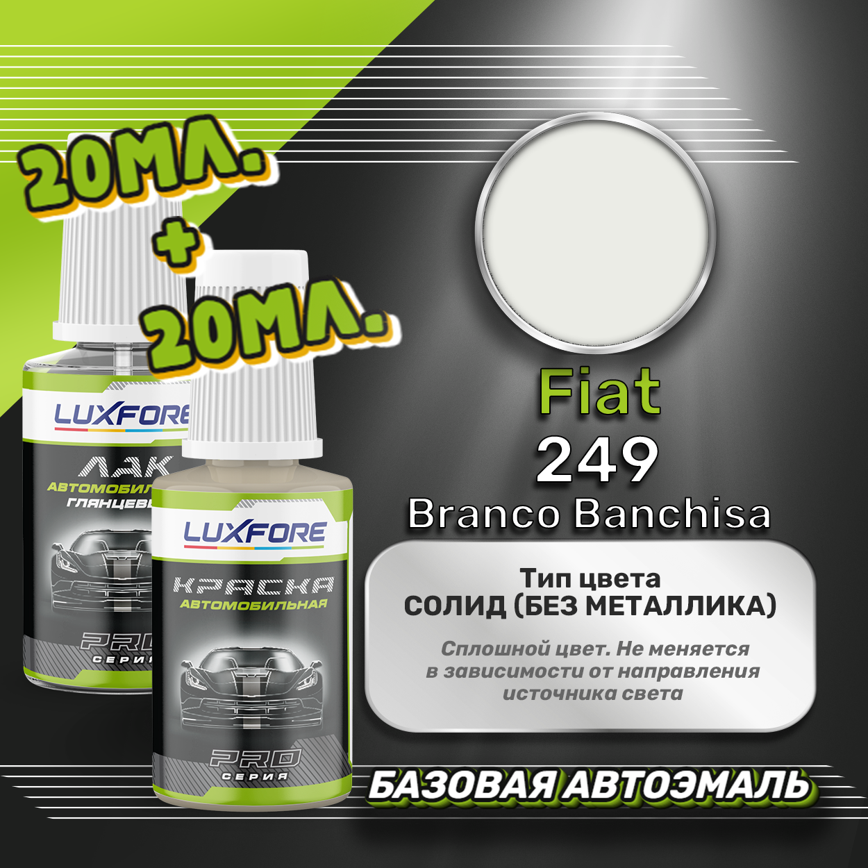Базовая автоэмаль Luxfore в подкраске с кисточкой объемом 20мл, по цветовому каталогу Fiat, цвет 249 Branco Banchisa + лак 20мл. Премиальная автомобильная краска, обладает высокой укрывистостью и скоростью сушки, что позволит вам: быстро и качественно провести предпродажную подготовку автомобиля, а также выполнить небольшой ремонт лакокрасочного покрытия самостоятельно. Примечание: Внимание! Все базовые автоэмали, не покрытые автомобильным лаком имеют тусклый матовый цвет, а также подвержены воздействию окружающей среды. Помните, что базовые автомобильные краски необходимо обязательно покрывать автомобильным лаком для защиты от воздействия окружающей среды, а также получения законченного глянцевого вида. Лак объемом 20мл. во флакончике с кисточкой, идет в комплекте.