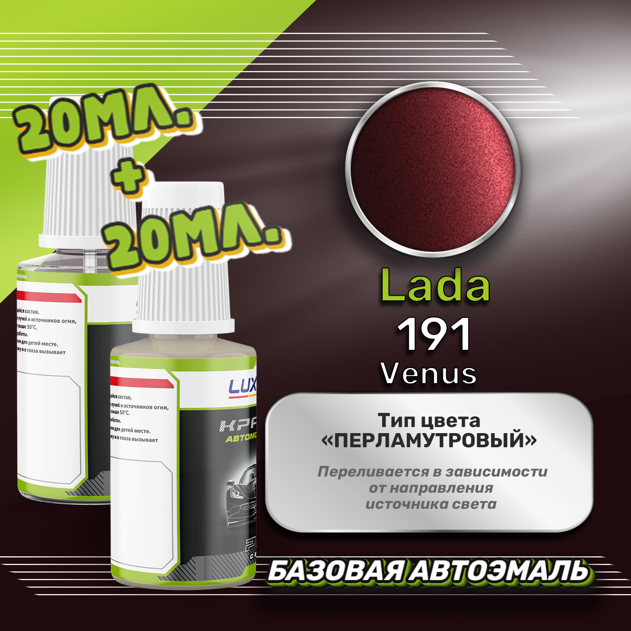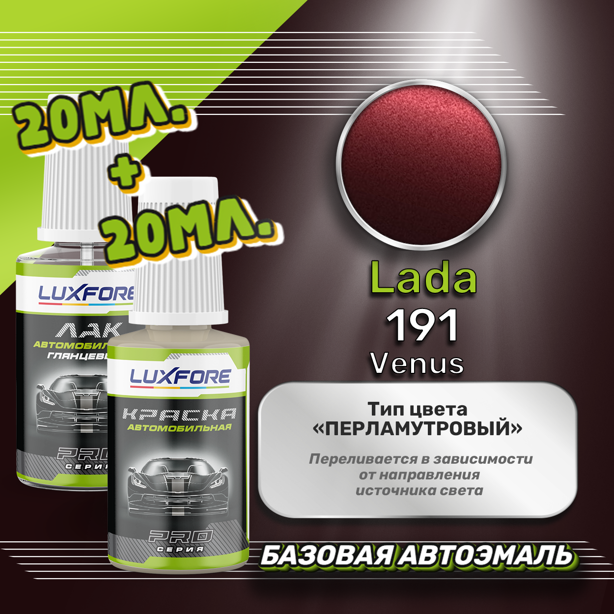 Базовая автоэмаль Luxfore в подкраске с кисточкой объемом 20мл, по цветовому каталогу LADA, цвет 191 Венера + лак 20мл. Премиальная автомобильная краска, обладает высокой укрывистостью и скоростью сушки, что позволит вам: быстро и качественно провести предпродажную подготовку автомобиля, а также выполнить небольшой ремонт лакокрасочного покрытия самостоятельно. Примечание: Внимание! Все базовые автоэмали, не покрытые автомобильным лаком имеют тусклый матовый цвет, а также подвержены воздействию окружающей среды. Помните, что базовые автомобильные краски необходимо обязательно покрывать автомобильным лаком для защиты от воздействия окружающей среды, а также получения законченного глянцевого вида. Лак объемом 20мл. во флакончике с кисточкой, идет в комплекте.