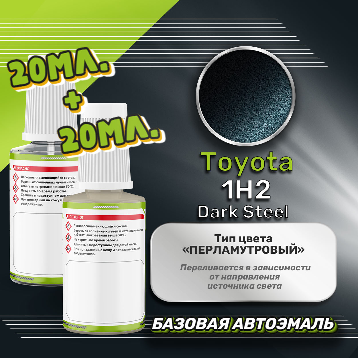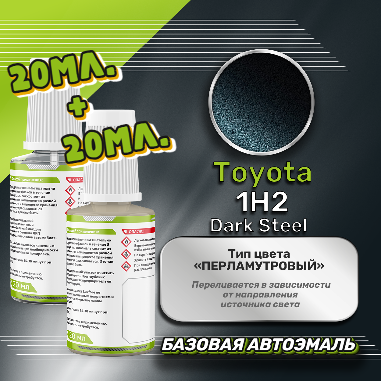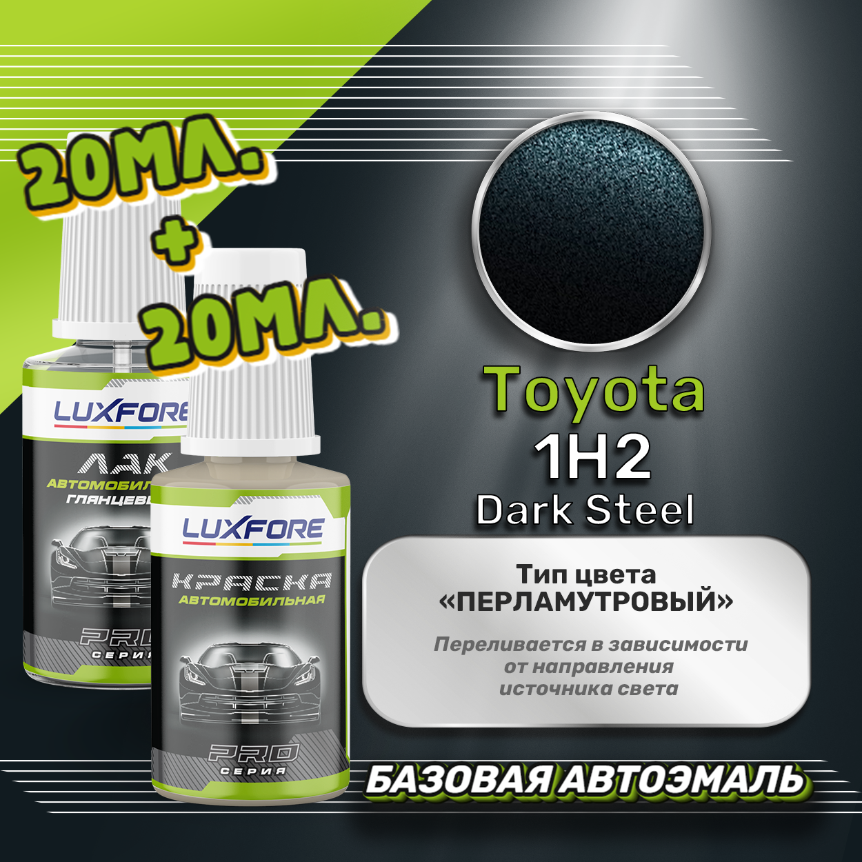 Базовая автоэмаль Luxfore в подкраске с кисточкой объемом 20мл, по цветовому каталогу Toyota, цвет 1H2 Dark Steel + лак 20мл. Премиальная автомобильная краска, обладает высокой укрывистостью и скоростью сушки, что позволит вам: быстро и качественно провести предпродажную подготовку автомобиля, а также выполнить небольшой ремонт лакокрасочного покрытия самостоятельно. Примечание: Внимание! Все базовые автоэмали, не покрытые автомобильным лаком имеют тусклый матовый цвет, а также подвержены воздействию окружающей среды. Помните, что базовые автомобильные краски необходимо обязательно покрывать автомобильным лаком для защиты от воздействия окружающей среды, а также получения законченного глянцевого вида. Лак объемом 20мл. во флакончике с кисточкой, идет в комплекте.