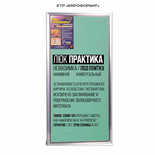 Ревизионный люк Практика Euroformat-R ЕТР 60x120 под плитку. Люк-невидимка необходим для доступа к счётчикам воды, к шаровым кранам подачи водоснабжения, к сливу под ванной. В проеме дверцы установлен силиконовый уплотнитель, который защищает от попадания пыли, влаги и обеспечивает звукоизоляцию.