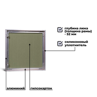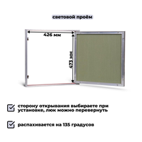 Технические характеристики: Расположение люка: Настенный, потолочный Тип люка: С распашной съемной дверцей Варианты отделки люка: Шпатлёвка, краска, обои Способ открывания: С помощью магнитно-нажимной защелки «Mini Latch» Высота: 500 мм Ширина: 500 мм Угол открытия люка: 130° Толщина (глубина) рамы люка: 52 мм Ширина проёма люка в свету: 473 мм Высота (длина) проёма люка в свету: 426 мм Ширина дверцы (крышки) люка: 473 мм Высота (длина) дверцы (крышки) люка: 473 мм Материал люка: Алюминиевый сплав, лист ГКЛВ Общий вес люка: 5,4 кг Срок службы: Не менее 10 лет Гаранти: 1 год