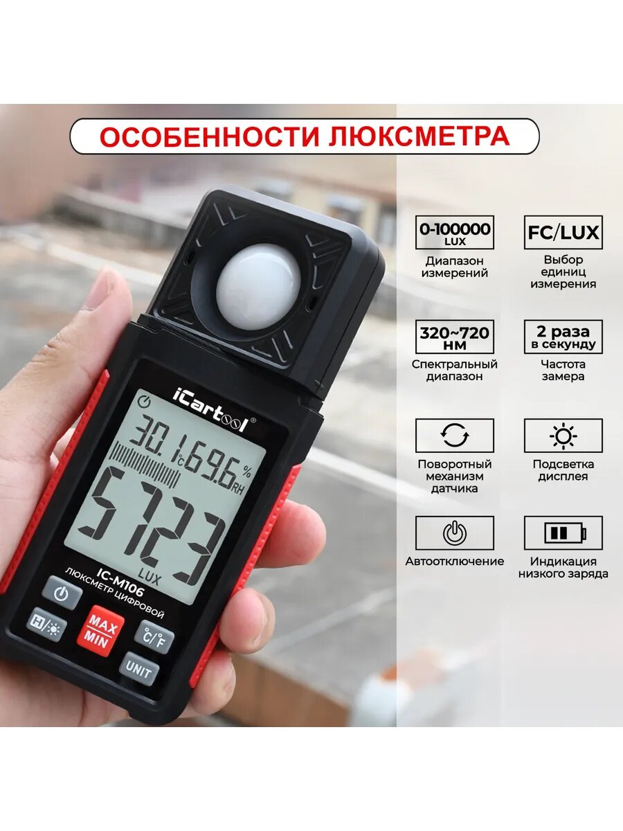 Цифровой люксметр iCartool IC-M106 — это профессиональный инструмент для измерения уровня освещенности в различных условиях. Разработанный для использования как в промышленной, так и в бытовой среде, он обеспечивает точные и надежные данные, необходимые для оценки светового окружения. Ключевые особенности: - Высокая точность измерений: обеспечивает достоверные данные об уровне освещенности, что позволяет оценивать и корректировать условия освещения для достижения оптимального светового баланса. - Простой в использовании интерфейс: интуитивно понятный дисплей с четким отображением результатов облегчает выполнение измерений даже для пользователей с минимальным опытом. - Компактная и портативная конструкция: легкий и удобный для транспортировки, что делает его идеальным инструментом для использования в различных локациях. - Широкий диапазон измерений: подходит для оценки освещенности как в жилых помещениях, так и на рабочих местах, включая фотографии, аудио-видео производства, сельское хозяйство и производства, где необходимы стандарты освещенности. Цифровой люксметр iCartool IC-M106 — это надежный выбор для тех, кто ценит точность и функциональность в измерении освещенности, обеспечивая профессиональный подход к световому анализу в различных сферах применения. Функциональные возможности: Измерение освещенности в диапазоне 0 – 100 000 люкс Выбор единиц измерения люкс / фут-свеча Поворотный механизм светового сенсора на 180° Автоматическая калибровка нуля Регистрация максимального и минимального значений Стоп кадр - сохранение данных на экране Преимущества: Автономное питание дает возможность измерять освещенность без привязки к бытовой электросети Большой легко-читаемый дисплей с подсветкой Настраиваемое автоотключение питания (через 10 мин) для экономии заряда батареи Индикация низкого заряда батареи Специальная крышка защищает оптический датчик от повреждений Прочный эргономичный корпус гарантирует долгий срок службы Характеристики: Элементы питания AAA/мизинчиковая(R03; LR03; FR03) Количество и напряжение элементов питания 3х1.5B Рабочая температура 0-40 °С Диапазон измерений 100000 Люкс Погрешность 3 Люкс Разрешение 0.1 Люкс Подсветка дисплея есть Вес нетто 0.23 кг