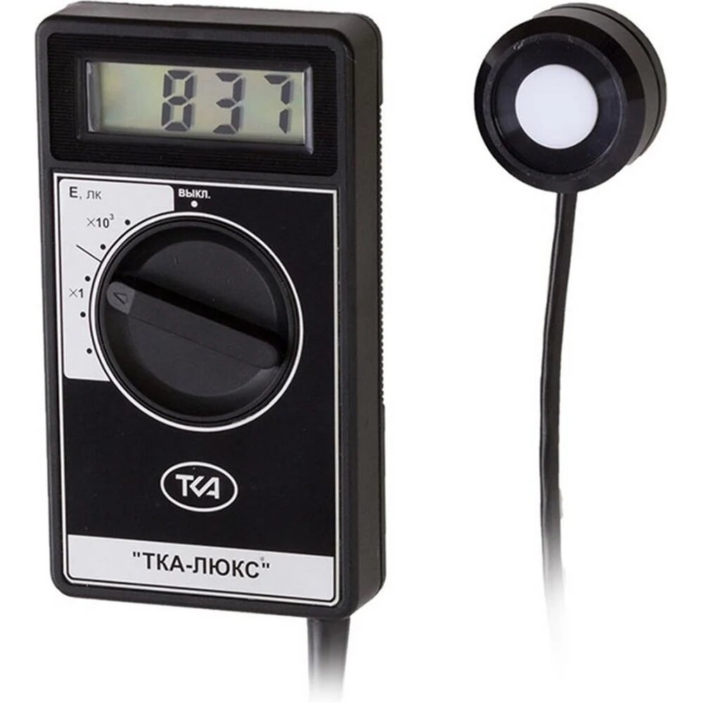 Люксметр "тка-люкс" - самая популярная модель данной серии на российском рынке. Тка-люкс предназначен для измерения освещённости в видимой области спектра (380 - 760 нм), создаваемой различными произвольно-расположенными источниками света в люксах. Данный прибор подходит для приближенной оценки светового потока большинства светильников, ламп и светодиодных модулей. Так же подходит для работы с фотолюминесцентными материалами, в т. ч. для получения лицензии МЧС (диапазоны измерения указаны в ГОСТ 12.2.143-2009 с изменениями от 14.12.2011 г). Люксметр "тка-люкс" внесен в государственные реестры РФ (№ 20040-11), Беларуси, Украины, Казахстана и Узбекистана. Срок гарантии и межповерочный интервал - 12 месяцев. Время непрерывной работы не менее 8 часов, масса не более 400 г