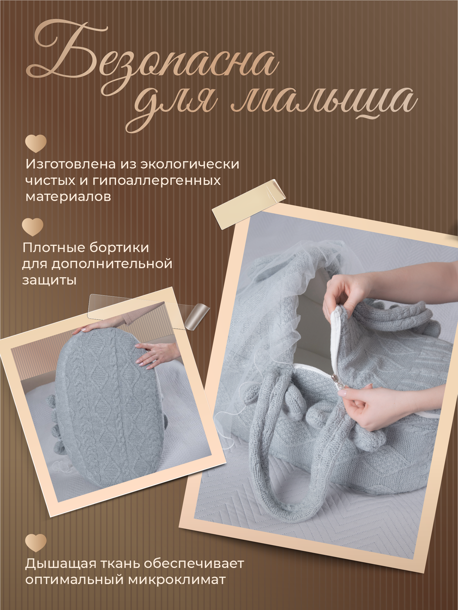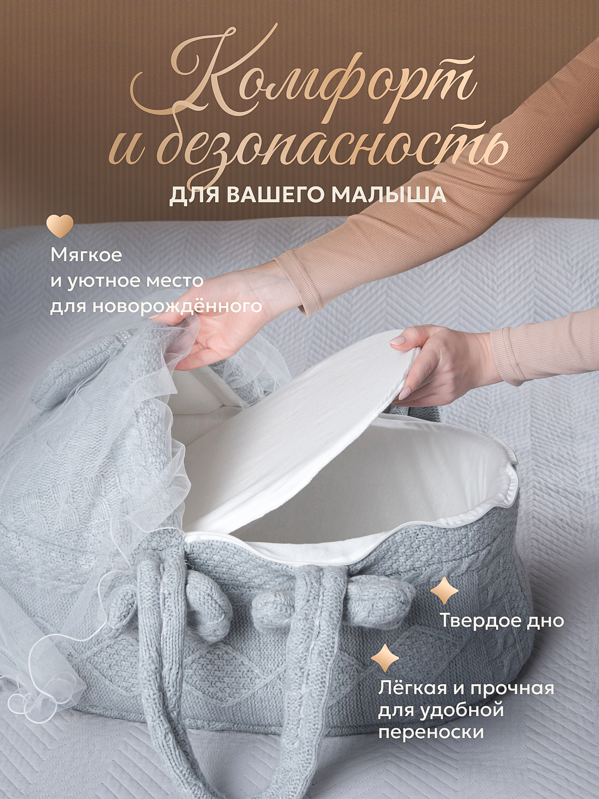 Корзина оснащена прочными ручками для переноски, что делает ее идеальным решением для выписки из роддома. Легкая и компактная, она позволит вам с комфортом переносить малыша, а мягкая внутренняя отделка обеспечит ему максимальный комфорт.