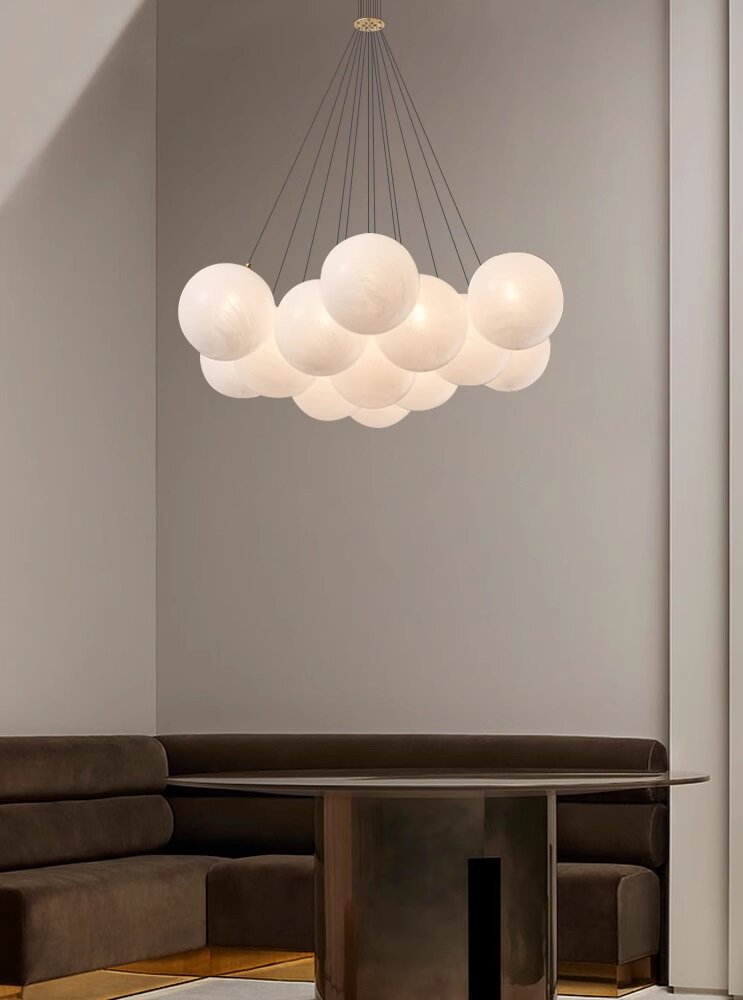 Люстра состоит из 13 стеклянных шаров диаметром 15 см, выполненных в кремовом узоре. Основание светильника цвета латуни, что придает ему особый шарм.