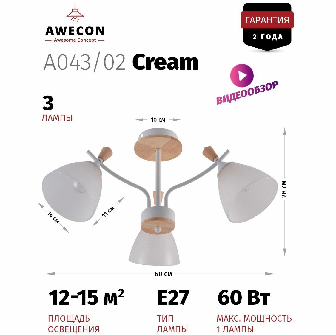 Люстра Awecon Cream, E27, 60W, 3 лампы, площадь освещения 15 кв. м: сравнение цен, характеристики, фото, актуальное наличие и цены.