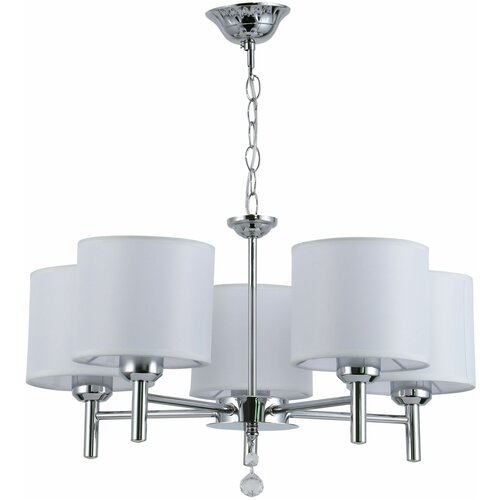 Светильник подвесной с пятью рожками и светлыми текстильными абажурами, отлично подойдет для установки на потолок гостиной, спальни, кухни, оформленных в стиле неоклассика. Произведен с использованием материалов: металл, текстиль и может использоваться для натяжного потолка. Подвесная люстра имеет простой и надёжный способ крепления - на крюк. Благодаря цепи возможно регулировать высоту светильника. Цвет основания - хром, абажуры- белые. Люстра осветит помещение площадью до 18 кв. м. Производитель рекомендует использовать лампы накаливания с цоколем E27 и мощностью 60W или эквивалентные им светодиодные - до 12 Вт. Размер абажура 14х14х12 см. Поставляется в разобранном виде. Лампочки в комплект не входят, приобретаются отдельно.