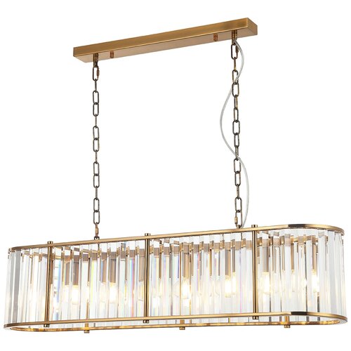 Подвесная люстра вытянутой формы из серии Washer имеет металлическую арматуру, гальванизированную в цвет бронзы и декорирована прозрачным хрусталем высшей категории прямоугольной формы. Каркас отделан металлическими кантами и дополнительно закрепленными металлическими стержнями, гальванизированными в цвет арматуры.