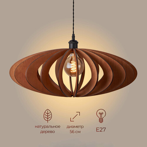 Потолочный светильник изготовлен из натурального, экологически чистого дерева — березы, Используется покрытие высокого качества, не имеющее запаха, и обладающее гипоаллергенными свойствами, что обеспечивает долгий срок службы и комфорт, Деревянный плафон имеет следующие габаритные размеры: диаметр 56 см ; высота 22 см, Люстра поставляется в собранном виде, а значит вам не понадобится изучать сложные схемы и тратить время на сборку, На плафон уже установлен провод с металлическим патроном E27, совместимый с большинством доступных лампочек, Длина подвеса может регулироваться от 10 см до 1м, Вся фурнитура исполнена в стильном черном цвете, патрон имеет матовое черное покрытие, а провод имеет тканевую оплетку, Повесить люстру не составит труда, в комплекте уже предусмотрена планка для размещения как на обычном, так и на натяжном потолке, Площадь освещения до 15 кв, м, Яркость будет зависеть от установленной лампочки, мы рекомендуем использовать светодиодные лампы или лампы Эдисона, С небольшой по мощности лампой может использоваться как ночник, а с яркой как основное освещение, Обратите, пожалуйста, внимание, лампочка в комплект не входит,