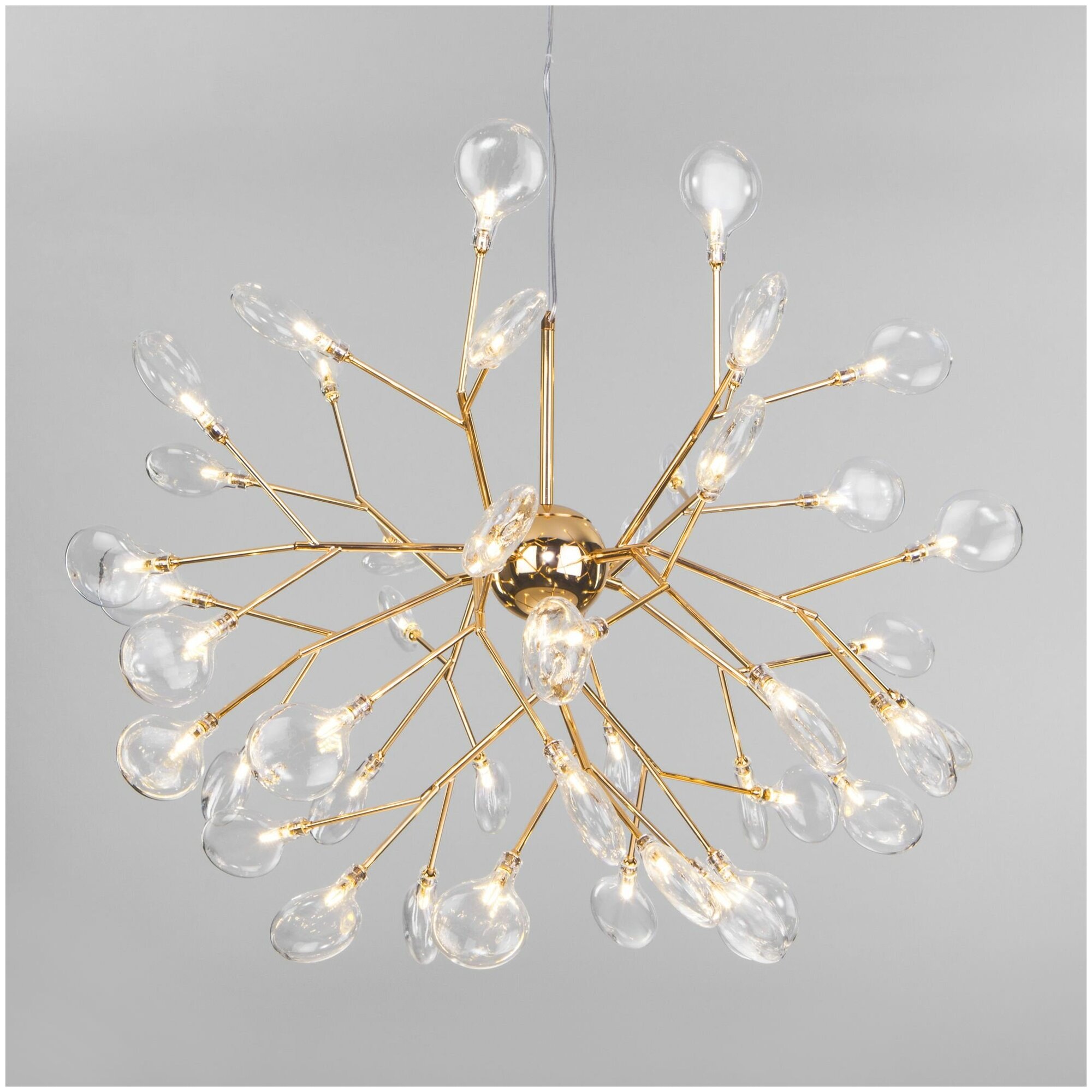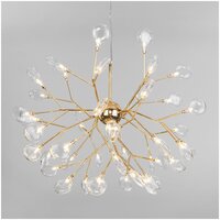 Подвесная люстра на 45 рожков золотая предназначена для создания основного освещения в современных и классических интерьерах, подходит для различных типов помещений: гостиная, спальня и рассчитана на площадь освещения 30 м. кв. Роскошная люстра оснащена патронами с цоколем G4, которые рассчитаны на максимальную мощность ламп 3 Вт. Люстра украшена декоративными стеклянными плафонами в форме лепестков. Арматура изготовлена из высококачественного металла с надежным защитным покрытием.